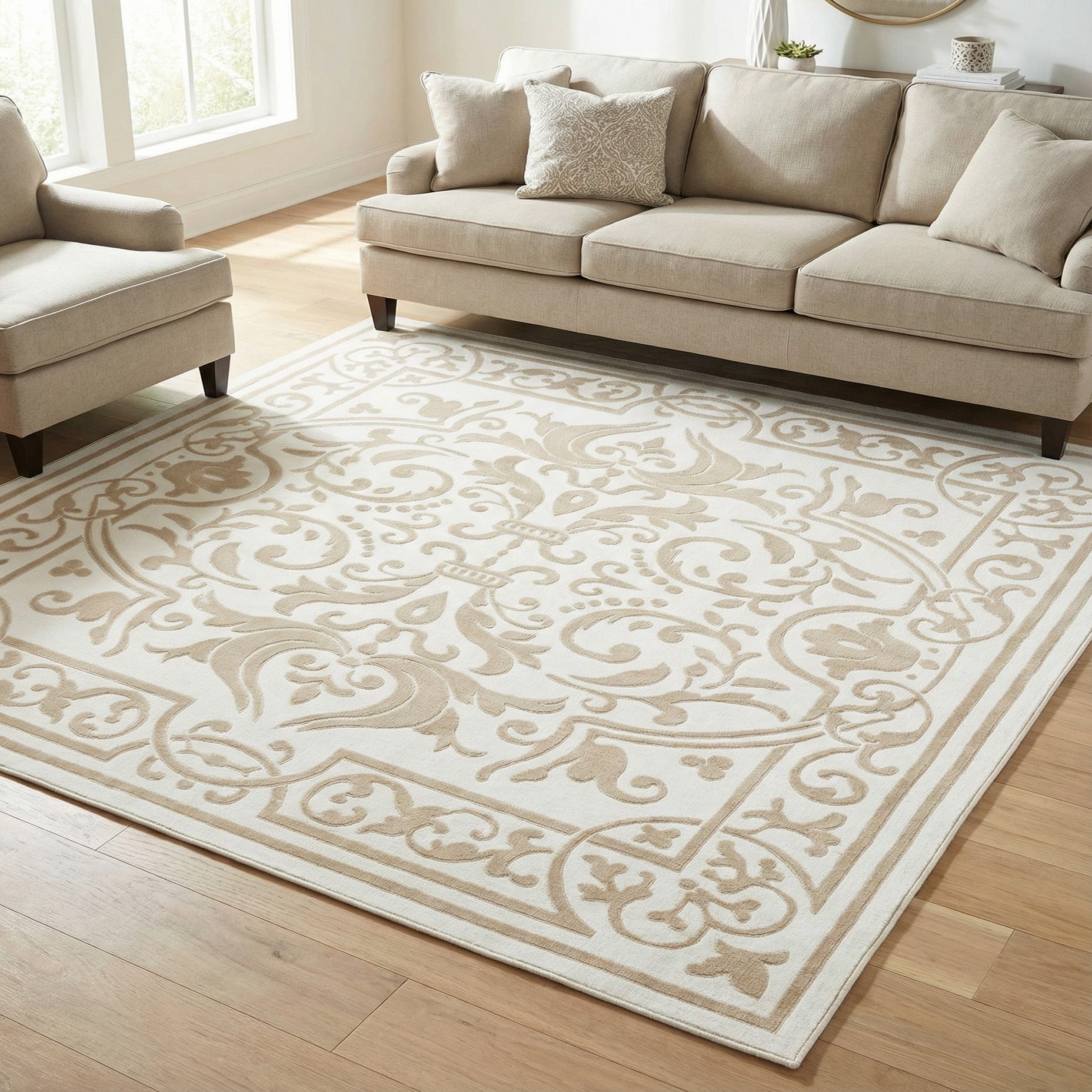 The Hermitage Collection offers a sophisticated 8 Ft Square rug designed for durability and style. Machine-woven with a blend of 55% Polypropylene and 45% Polyester, this piece ensures long-lasting resilience while maintaining a soft touch. The rug features a Snow White background, accented gracefully with a Beige pattern. Its design showcases a harmonious combination of scrollwork and florals, delivering an elegant and timeless aesthetic.
