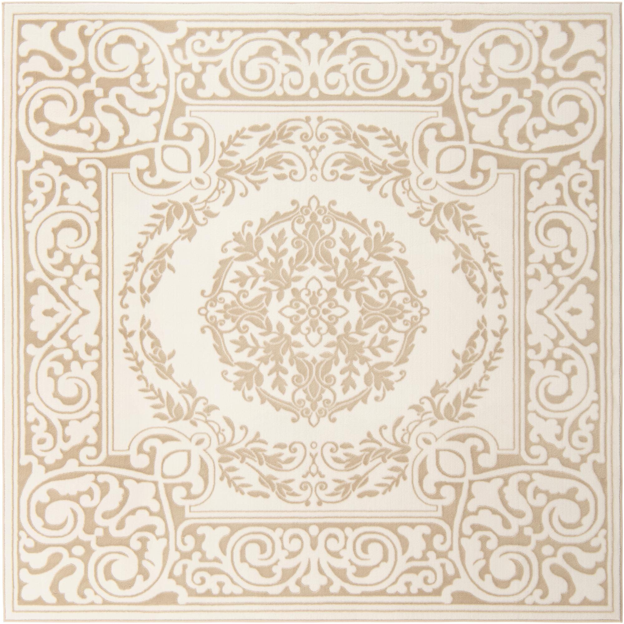 A 7' 10 x 7' 10 square white rug with a detailed beige vintage medallion and ornate border pattern.