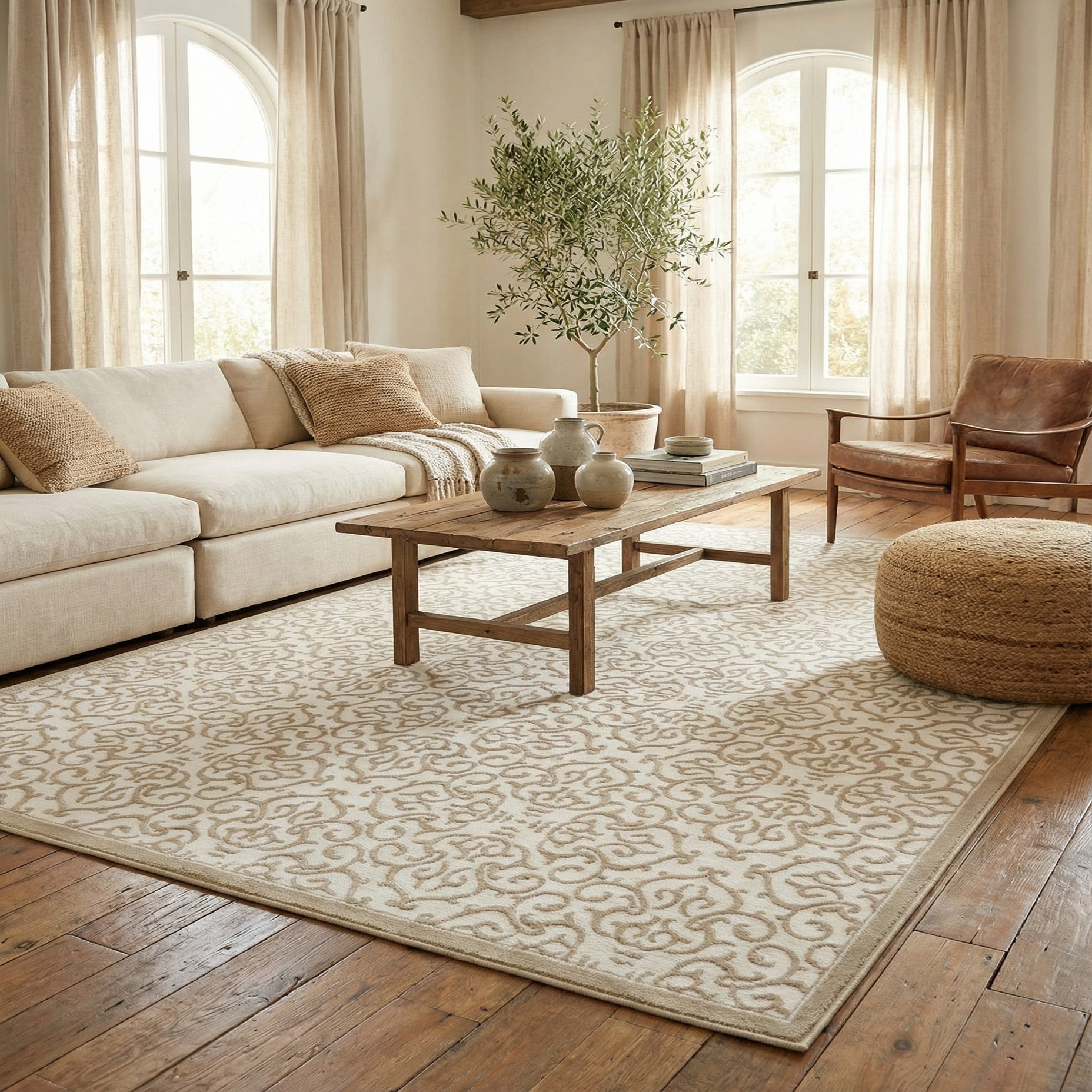 This neutral palette and transitional pattern work well in living rooms under a sofa and coffee table, anchored beneath a bed with layered bedding, or in an entry where a calm, welcoming tone is desired. Pair it with light wood furniture and linen upholstery for a relaxed, coastal look, add warm metallic accents and textured throws for a modern farmhouse setup, or keep furnishings minimal for a contemporary space that benefits from a soft decorative layer.