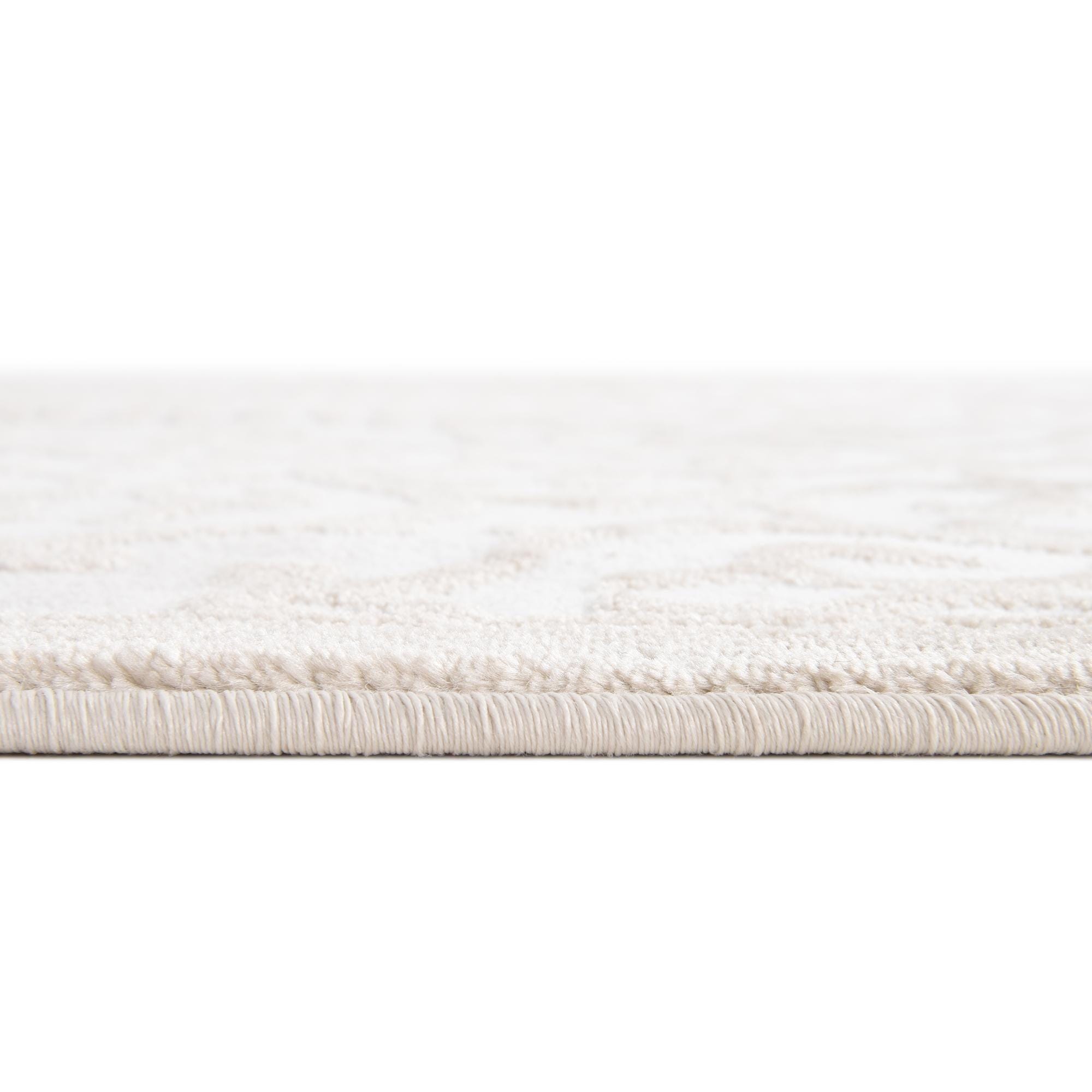 A soft Snow White field provides a clean, airy backdrop for an all-over beige scroll and medallion motif. The repeating arabesque pattern has a gently raised texture against the flatter ground, giving the rug subtle depth without heavy contrast. Machine made from 55% polypropylene and 45% polyester, the pile is low-profile and smooth to the touch with a slight sheen from the polyester yarns, creating a comfortable underfoot feel that reads as refined and quiet.