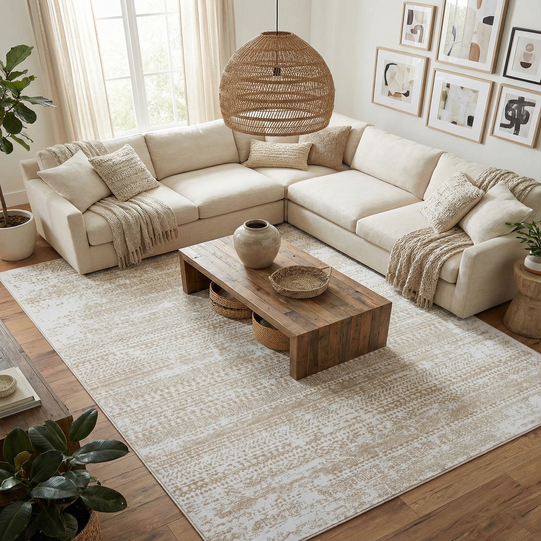 This rug's stain-resistant quality and shed-free nature ensure it remains a practical choice for high-traffic areas such as living rooms, dining areas, or large entryways. Its understated elegance could also provide a serene backdrop in a minimalist bedroom setting or offer a refined touch to a home office. The neutral hues and timeless design allows for this piece to seamlessly integrate with a range of color schemes and furniture choices, enhancing the overall ambiance of any room it graces.