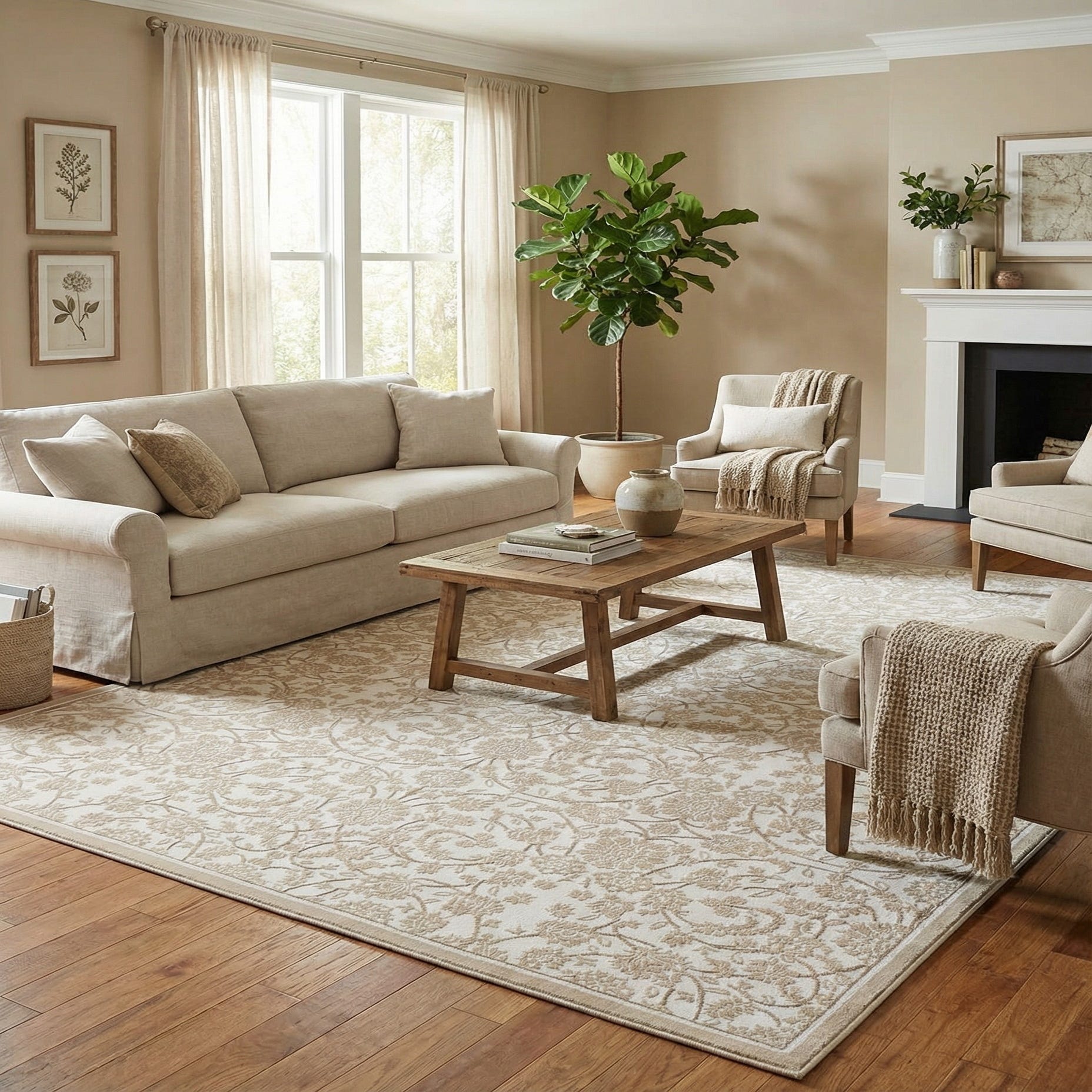 Use it to brighten a neutral living room beneath a sofa and coffee table, or layer it under a dining set to keep the palette light and cohesive. It also complements coastal, Scandinavian, and modern farmhouse schemes—pair with light wood furniture, linen upholstery and brass or matte black accents for balanced, calming interiors. The understated colorway and refined pattern make it equally suitable for a serene bedroom or a transitional foyer.