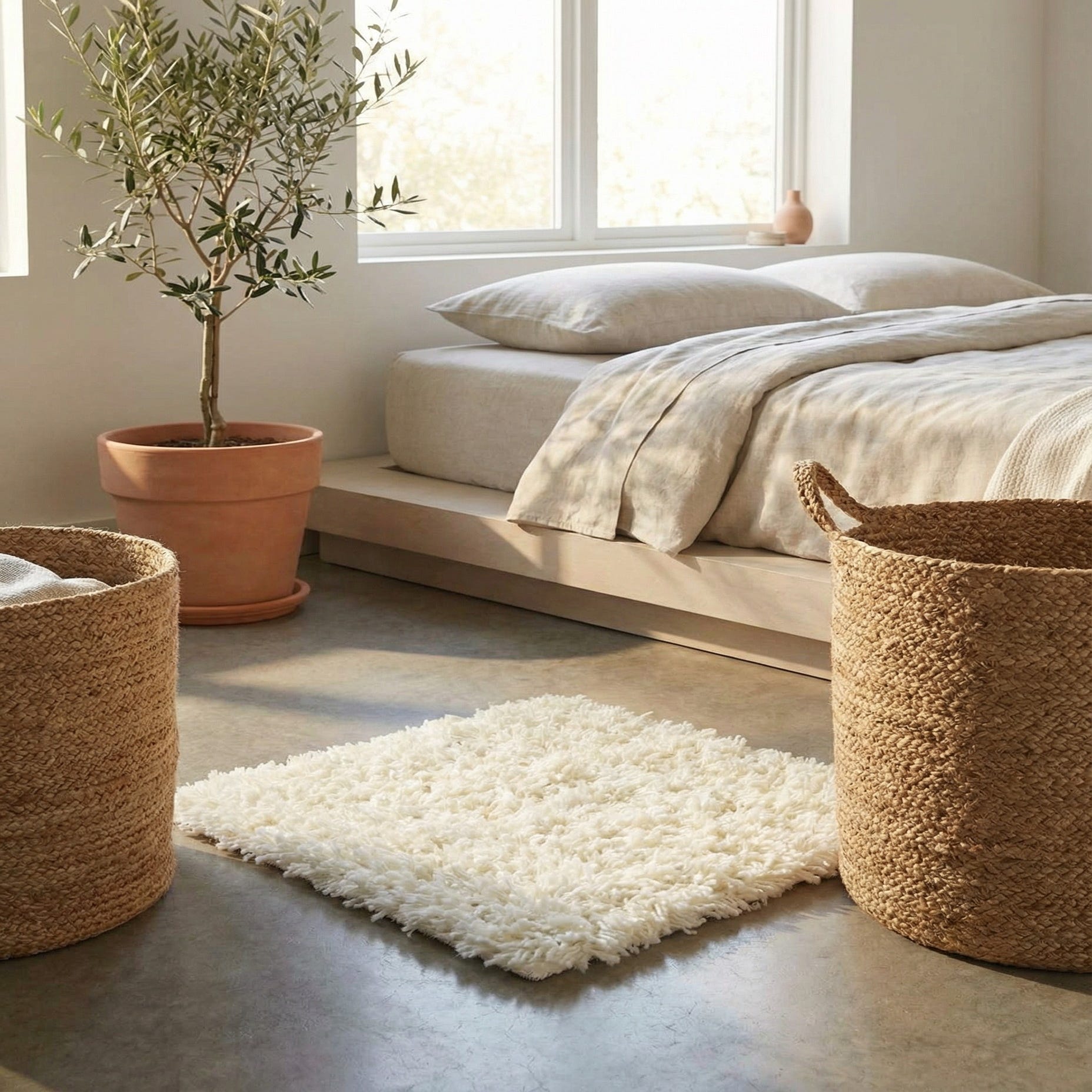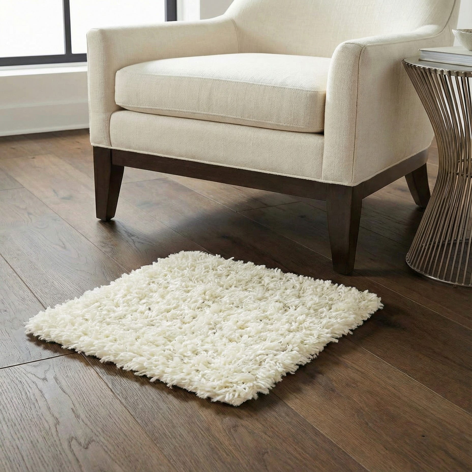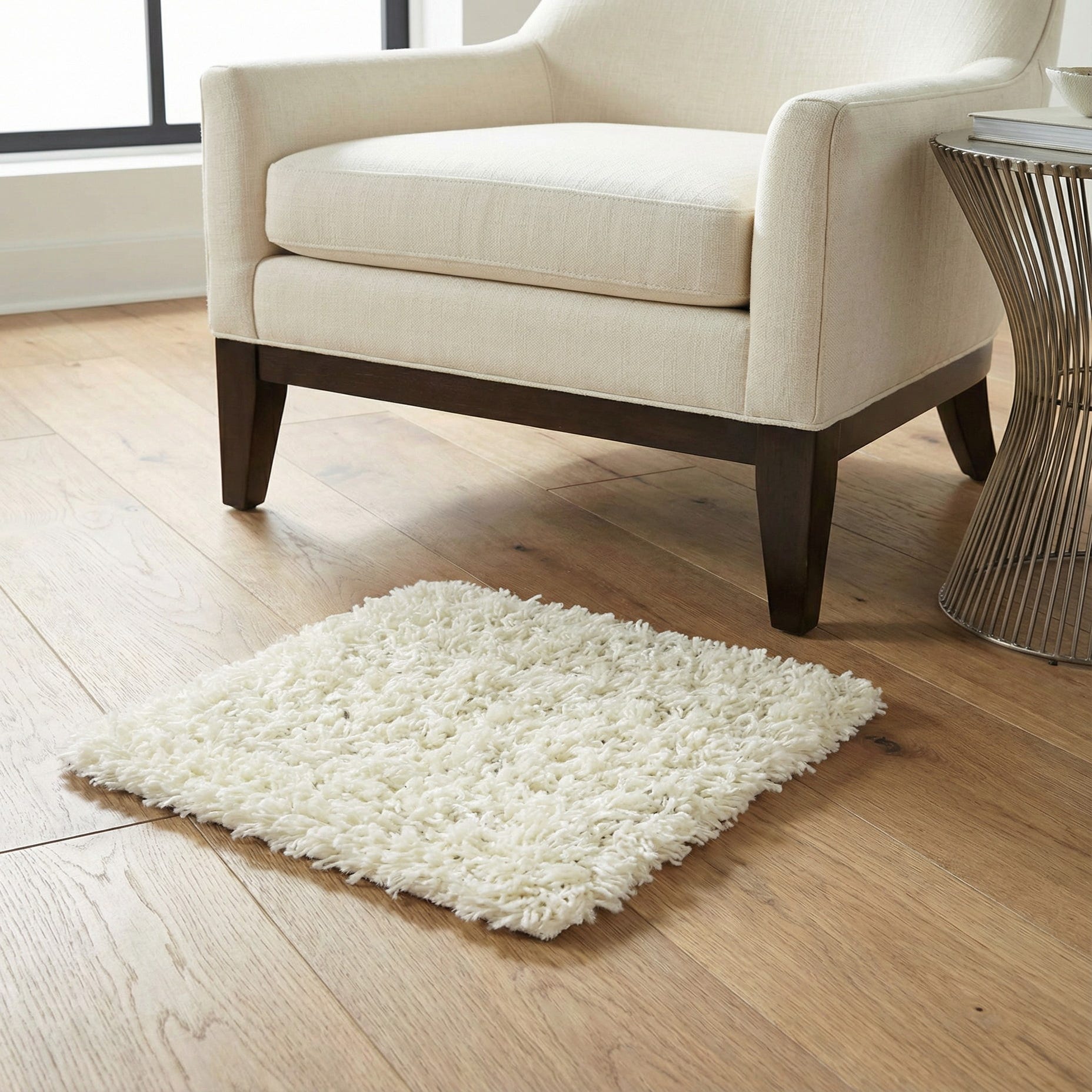 Well-suited to bedrooms, cozy living rooms, or a quiet reading nook, this rug pairs easily with natural wood tones, soft linens, and matte metal accents. Use it to soften modern minimalist or Scandinavian interiors, layer it over a larger neutral rug in a contemporary open space, or add contrast under leather seating in a mid-century inspired room. Its neutral color and plush texture make it a versatile choice for spaces that prioritize comfort and a calm, restrained palette.