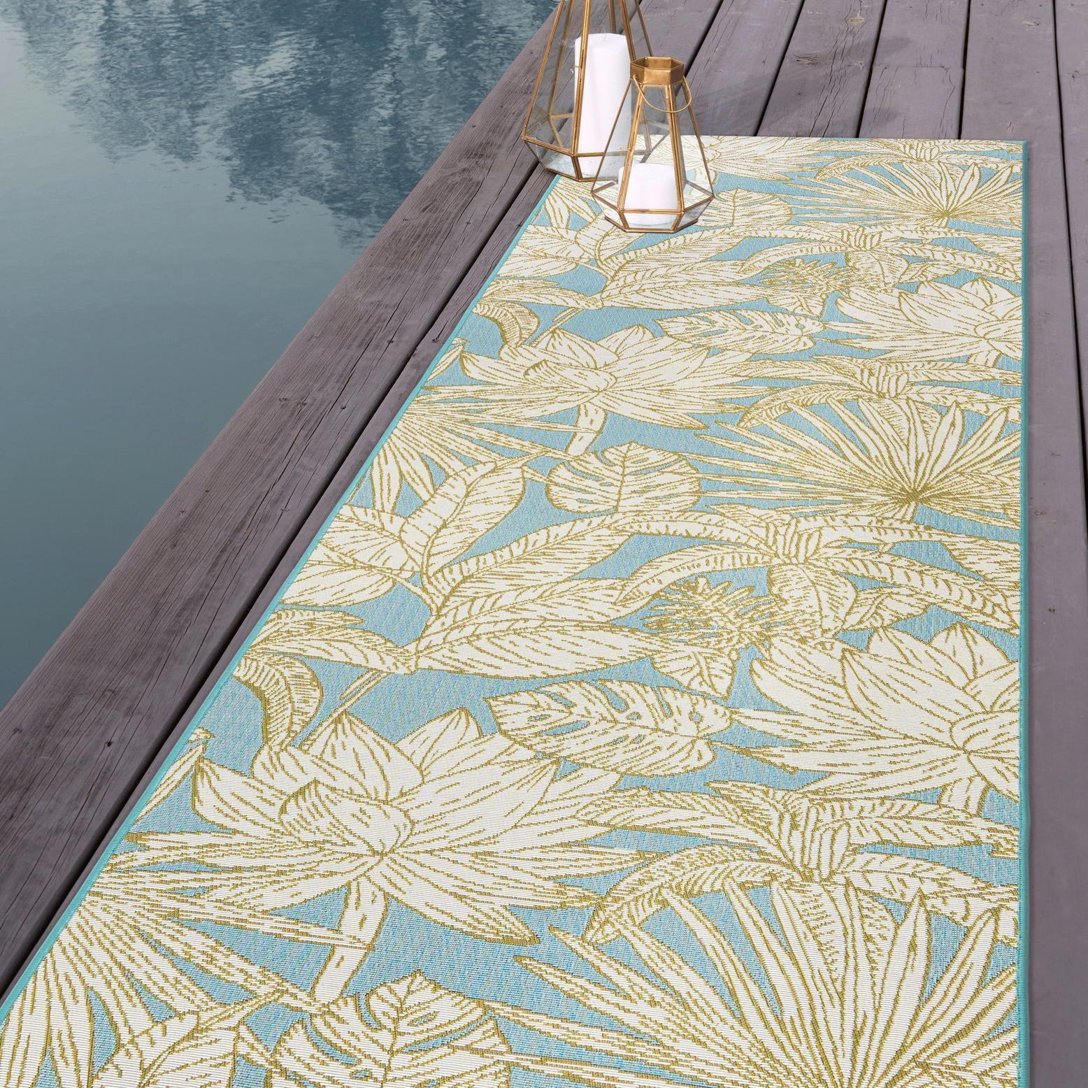 A 5 Ft Runner rug from the Outdoor Botanical collection by Rugs.com, featuring a modern floral pattern with soft blue background and cream-colored tropical leaves.