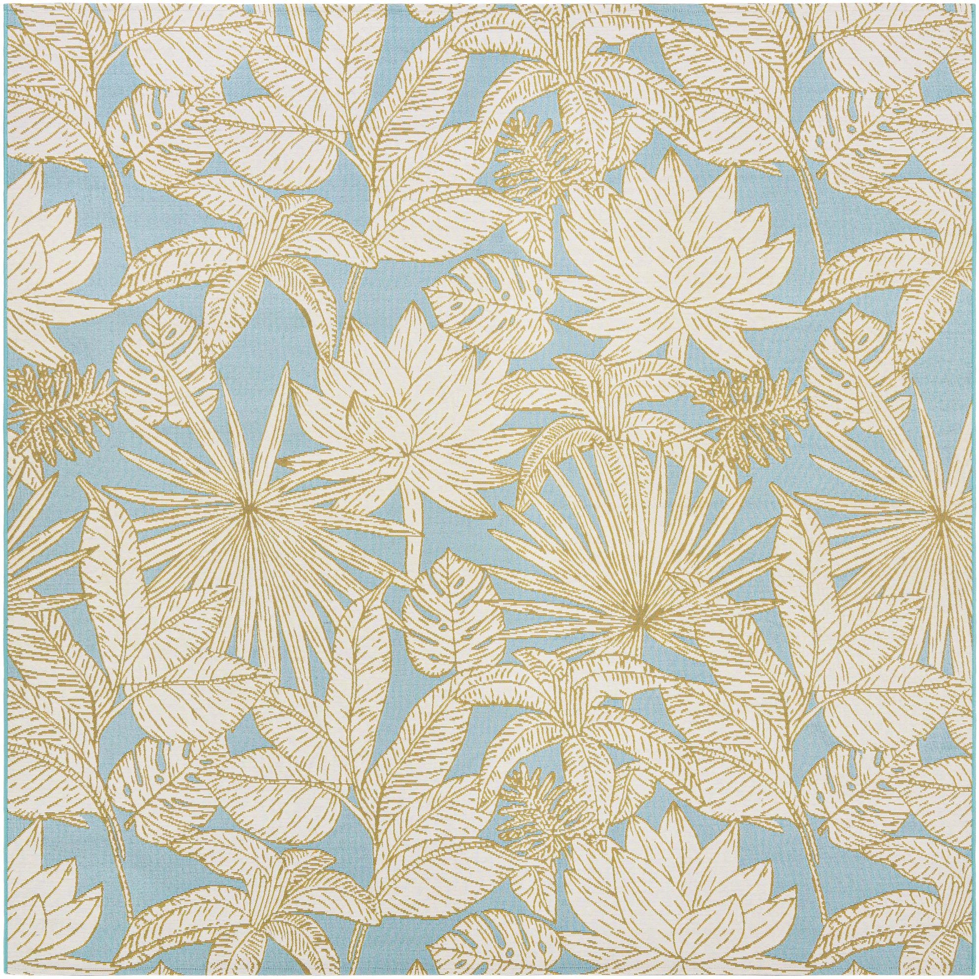 A square 7' 10 x 7' 10 indoor/outdoor rug with a soft blue background and a modern botanical pattern of gold and white leaves and flowers.