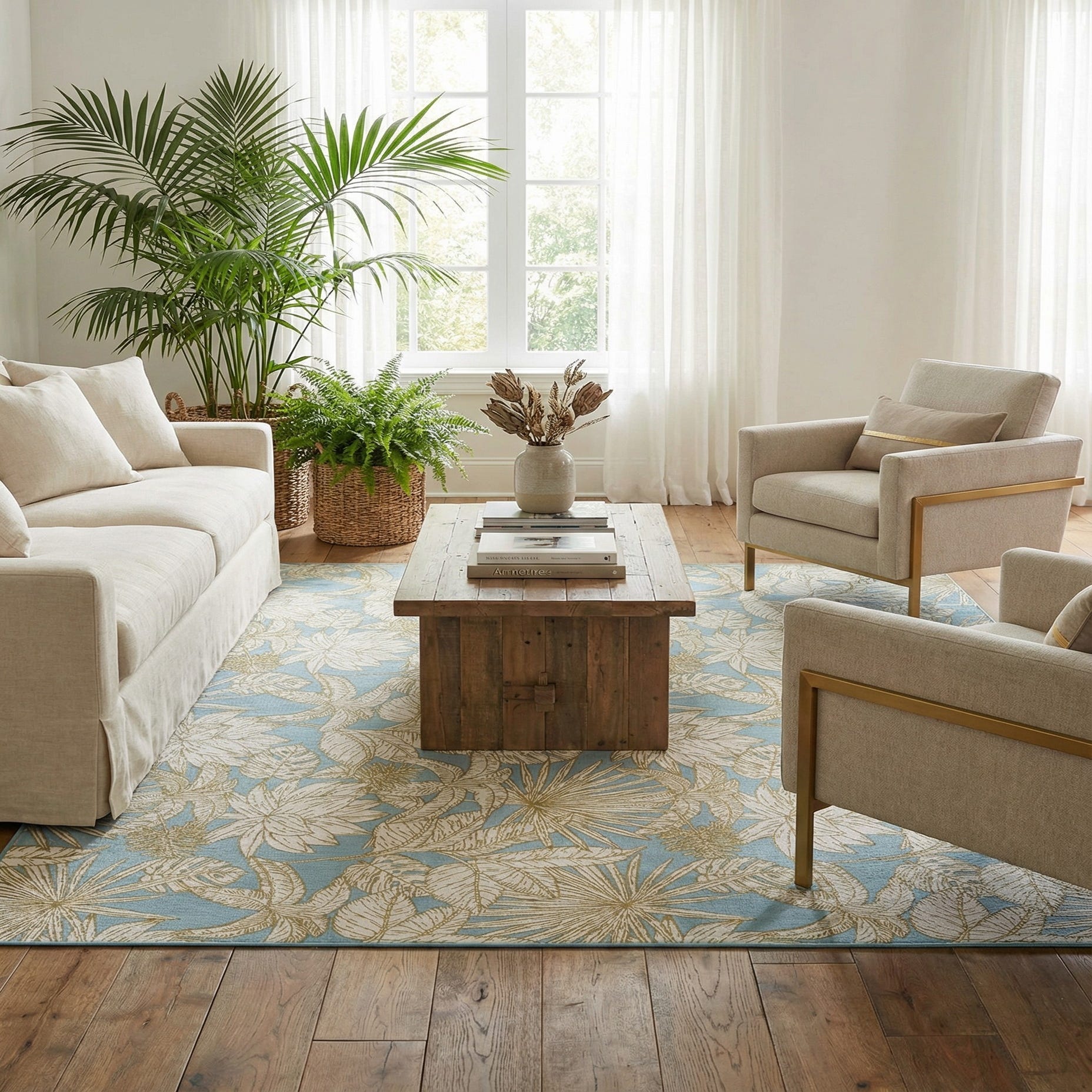 A 9x12 rectangular rug with a soft blue background and an intricate pattern of white and gold tropical leaves and flowers, suitable for indoor or outdoor use.