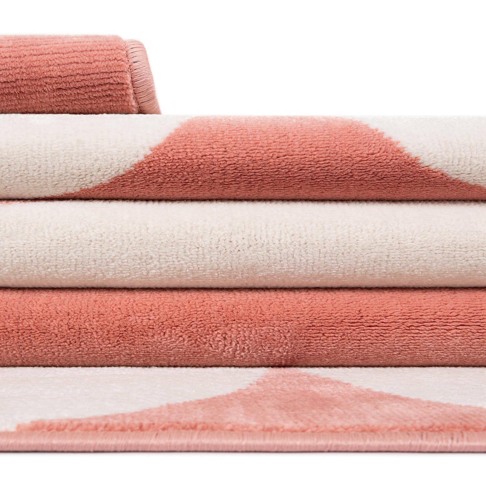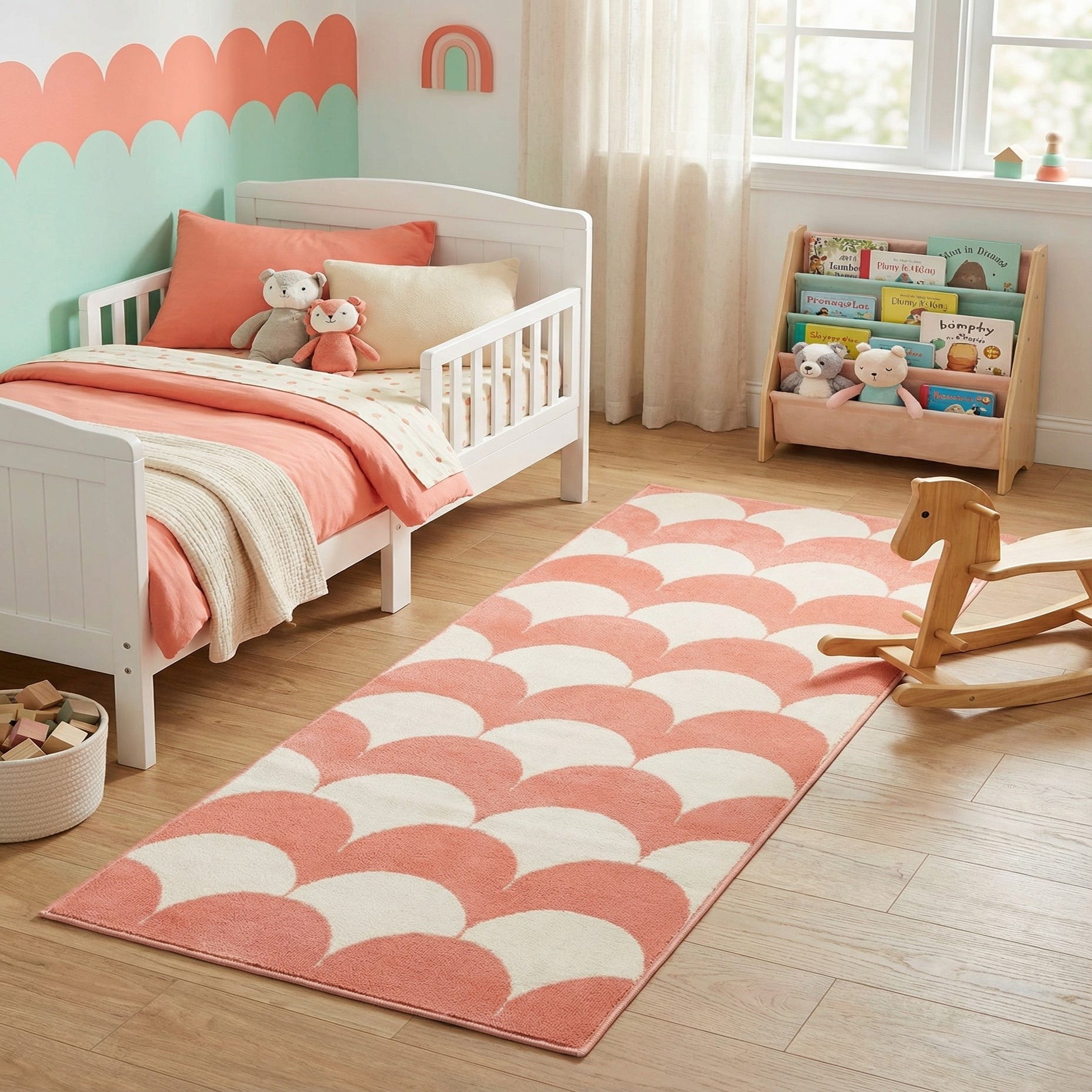 The look leans playful-modern with a retro touch, making this runner a good fit for a nursery, children's room, or a bright hallway. Pair it with light wood furniture and neutral linens for a Scandinavian-inspired nursery, introduce it to a coastal or contemporary bedroom for a pop of warm color, or place it down a corridor to lead the eye between rooms. Its clean geometry and warm coral tone coordinate well with white trim, natural textures, and muted metallic accents.