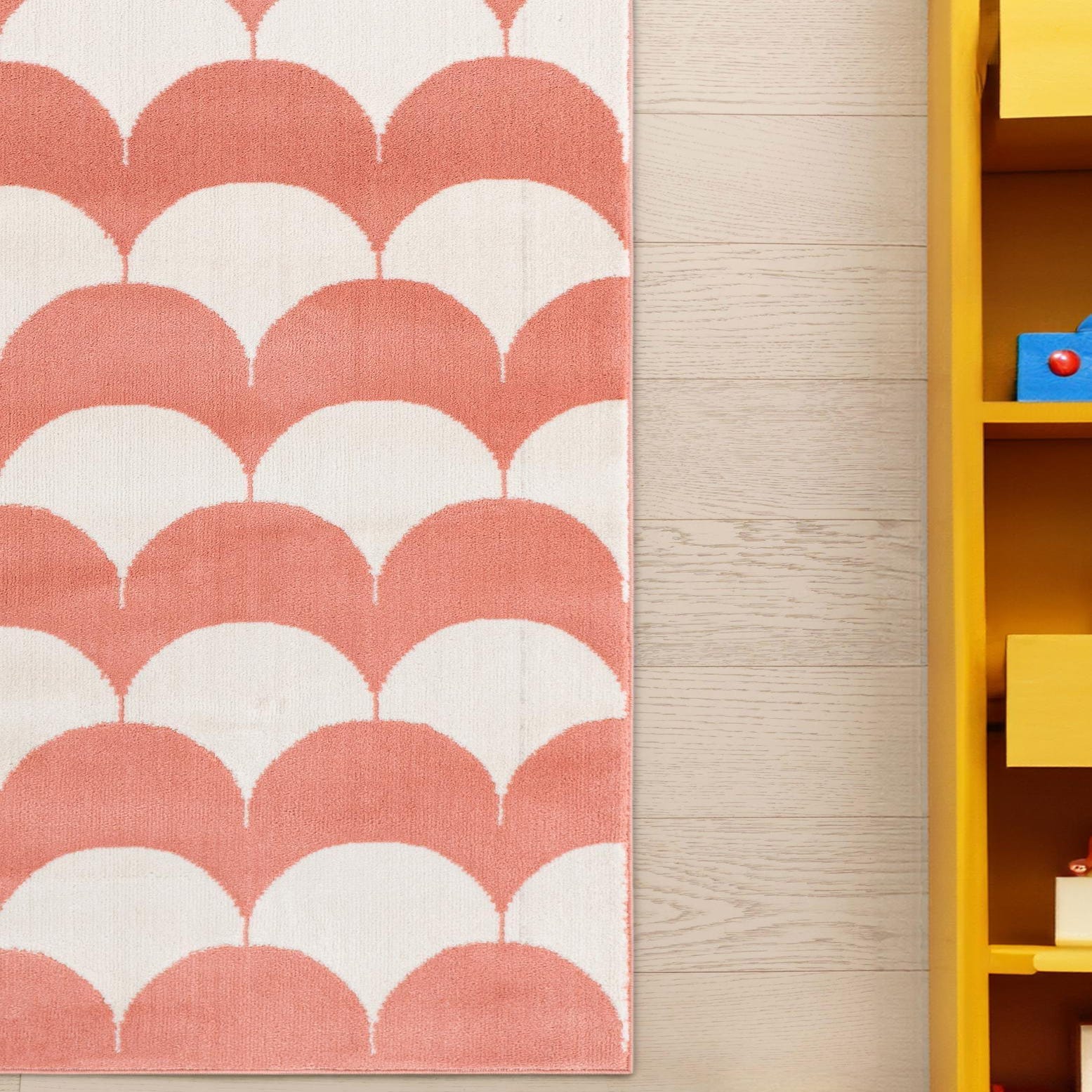A repeating scalloped pattern of stacked semi-circles creates a lively, graphic rhythm across the surface. The background color is Soft Coral Pink, with Ivory arches arranged in offset rows to form a modern scallop motif. Machine-made of 100% polypropylene, the runner has a soft, low-profile pile with a slightly dense, even surface that feels pleasant underfoot and keeps the pattern crisp.