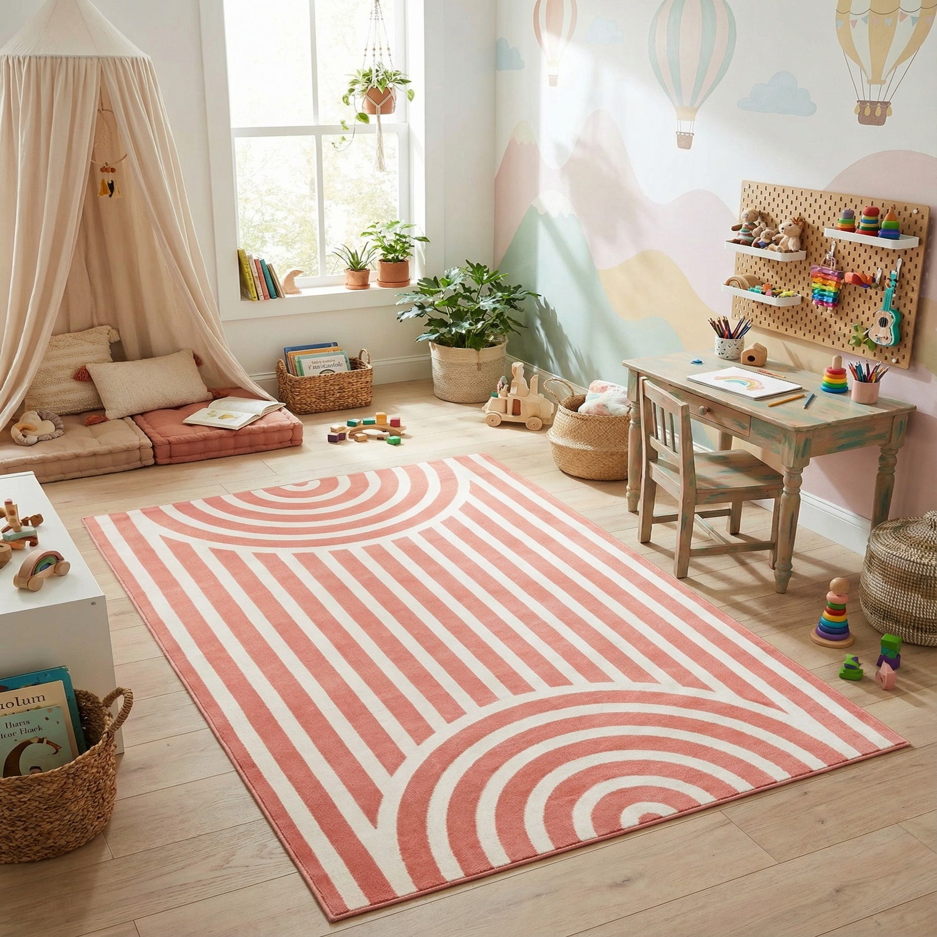 A playful geometric pattern anchors this rug with crisp ivory lines set against a soft coral pink background. Vertical stripes run the length of the rug and are bookended by concentric semicircles at each end, creating a balanced, modern look that reads clean and intentional. Machine-made from 100% polypropylene, the pile is low and tightly woven so the pattern edges stay sharp while the surface feels smooth and slightly cushioned underfoot.
