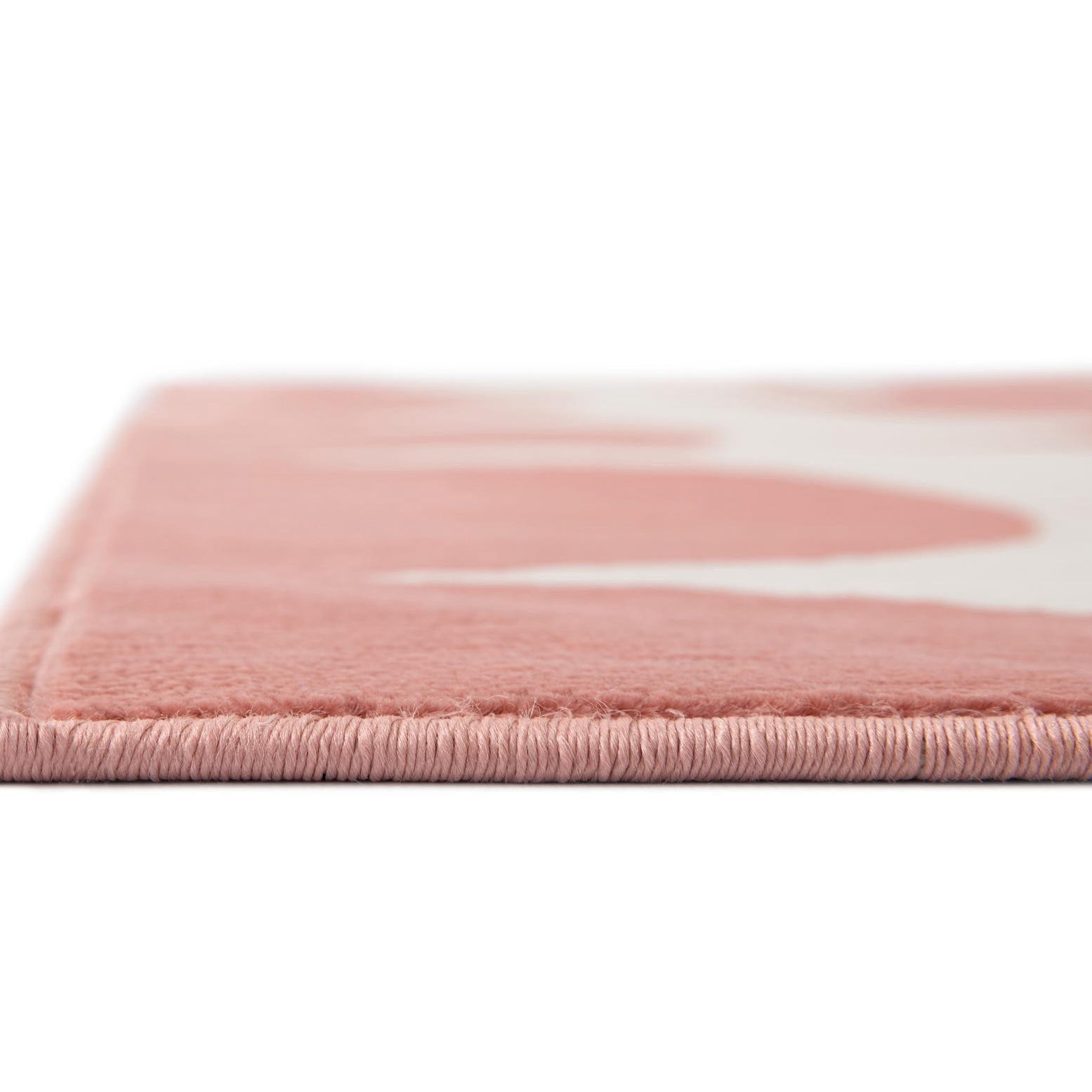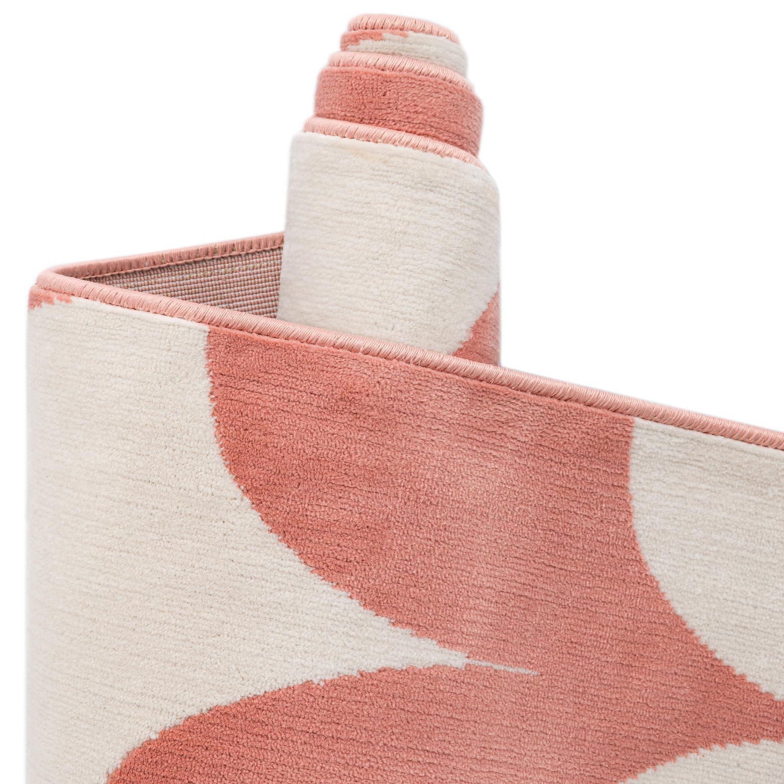 A lively scallop pattern repeats across a soft coral pink field, the ivory semicircles forming a rhythmic, scalloped wave that brings playful movement to the floor. Machine made of 100% polypropylene, the rug has a soft, low-pile texture that feels comfortable underfoot while keeping a neat, tailored appearance. The clear color contrast and clean edges give the design a modern, youthful look without feeling fussy.