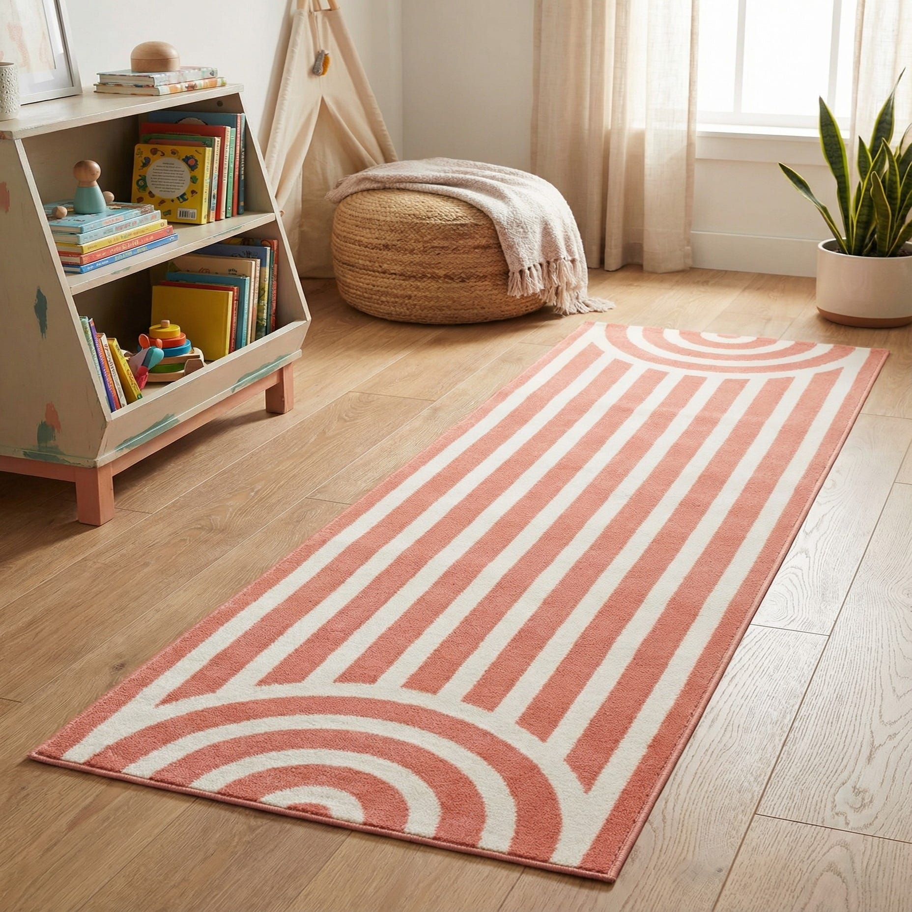 A crisp geometric runner with vertical ivory stripes set against a Soft Coral Pink background, punctuated by concentric arch motifs at each end. Machine made from 100% polypropylene, the rug has a low-pile, slightly plush texture that feels soft underfoot while keeping the linear pattern sharply defined. The combination of warm coral and clean ivory creates a modern, playful aesthetic with a subtle midcentury influence.