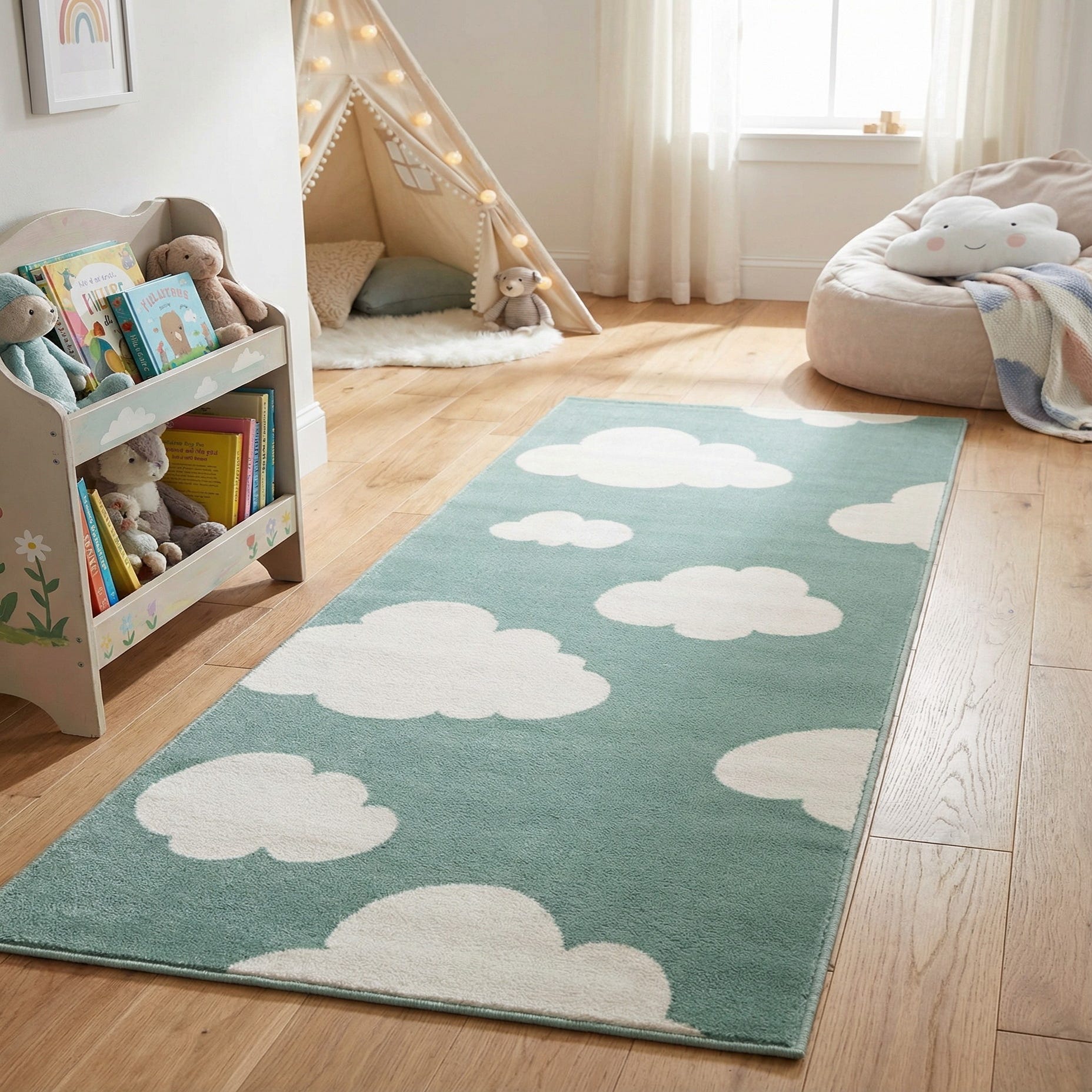 Soft green provides a calm backdrop for a playful pattern of ivory cloud silhouettes that float across the runner. The rounded, oversized shapes create a whimsical, graphic look while keeping the overall feel simple and modern. Machine-made from 100% polypropylene, the rug has a dense, low-profile pile that feels soft to the touch and lays flat for a smooth, even surface; the ivory clouds offer a gentle textural contrast against the soft-green field.