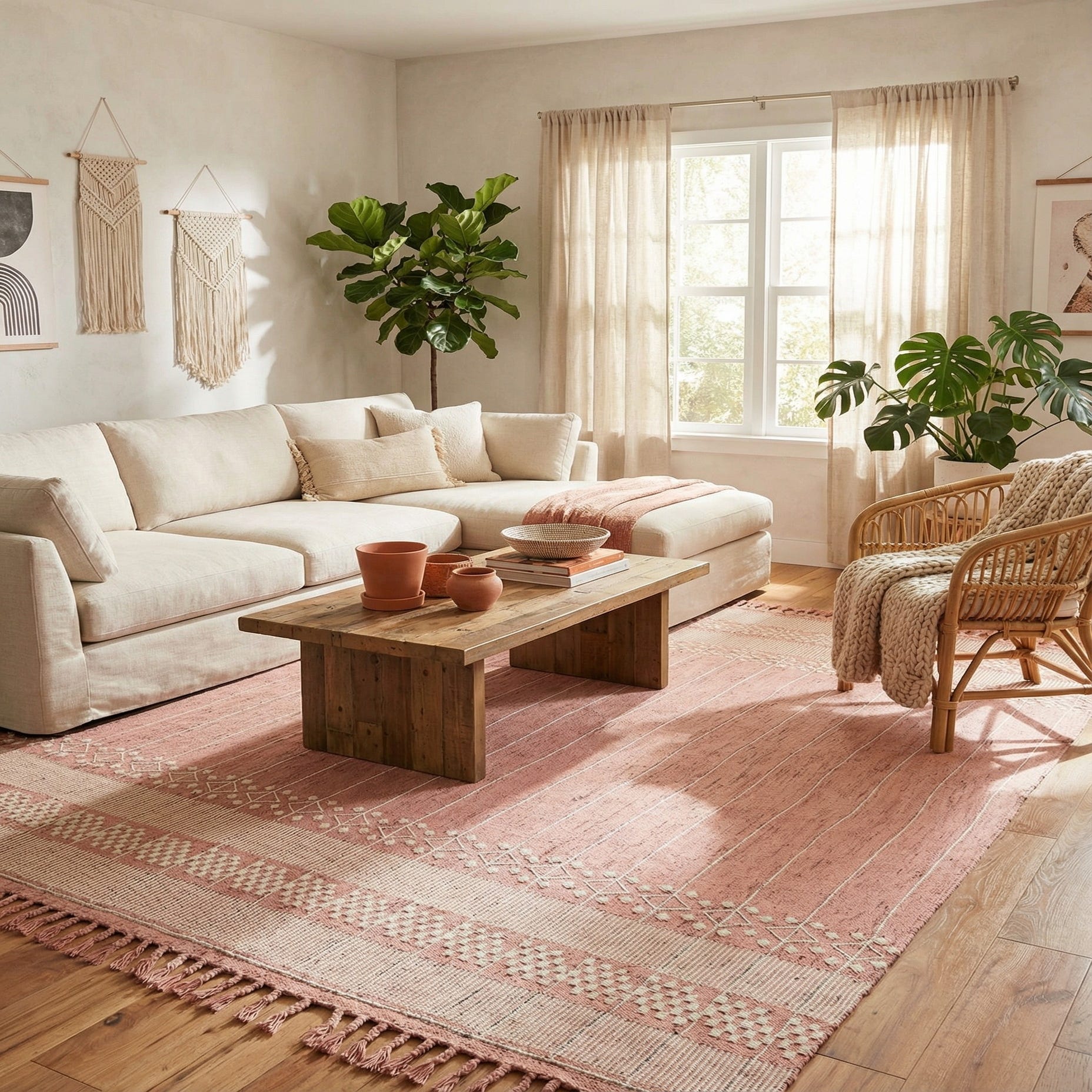 A 10x14 rectangular soft pink Eco Bohemian rug with white stripes and geometric patterns, featuring tassels on the ends.