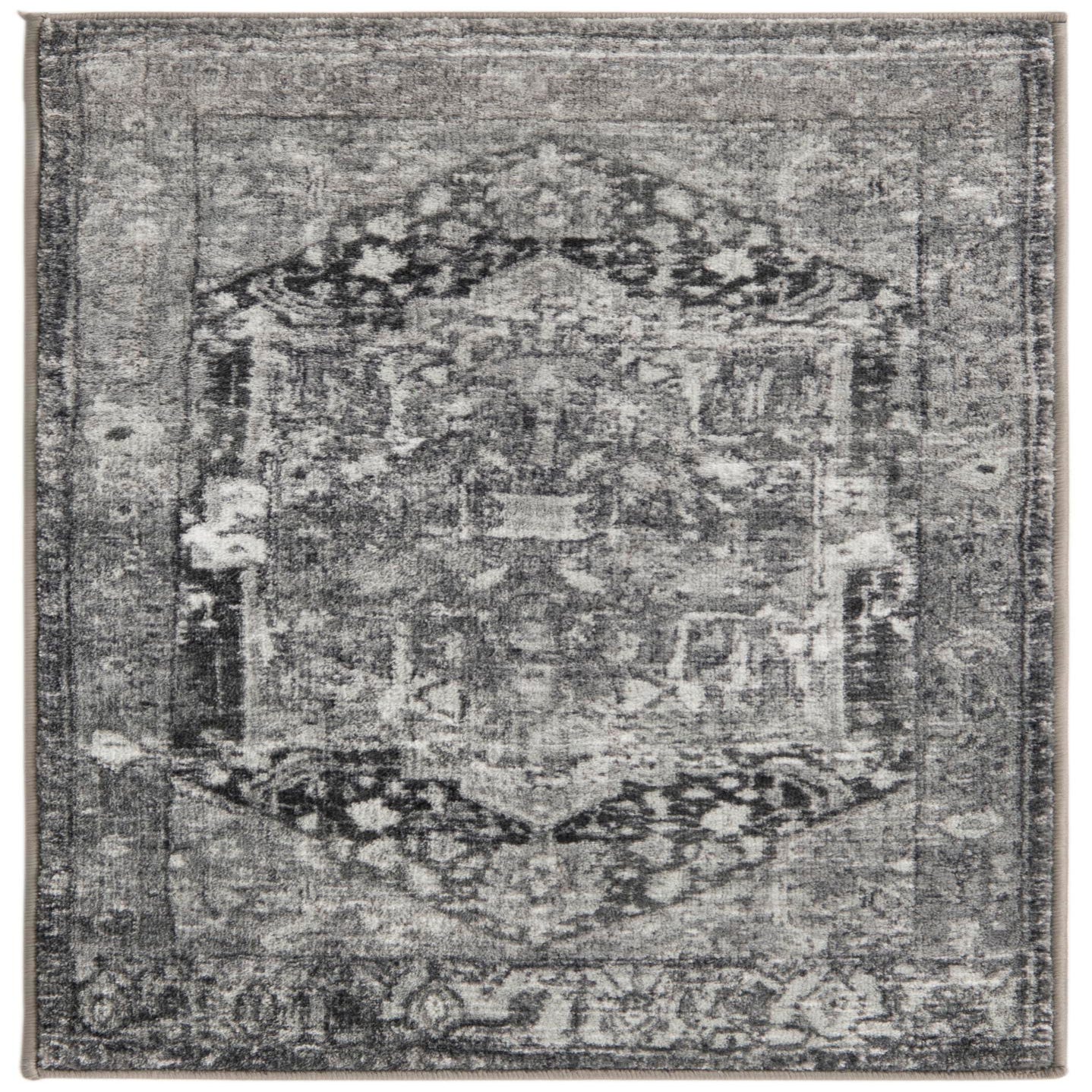 A steel gray field forms the foundation for a softly distressed medallion motif in black and ivory. The pattern combines classic floral and geometric elements with a worn, vintage-inspired finish—an ornate center panel sits within a subtle border, while the faded contrast gives the design depth and a lived-in character. Machine-made of polyester, the low-profile pile feels smooth and slightly velvety to the touch with a gentle sheen that highlights the tonal variations.