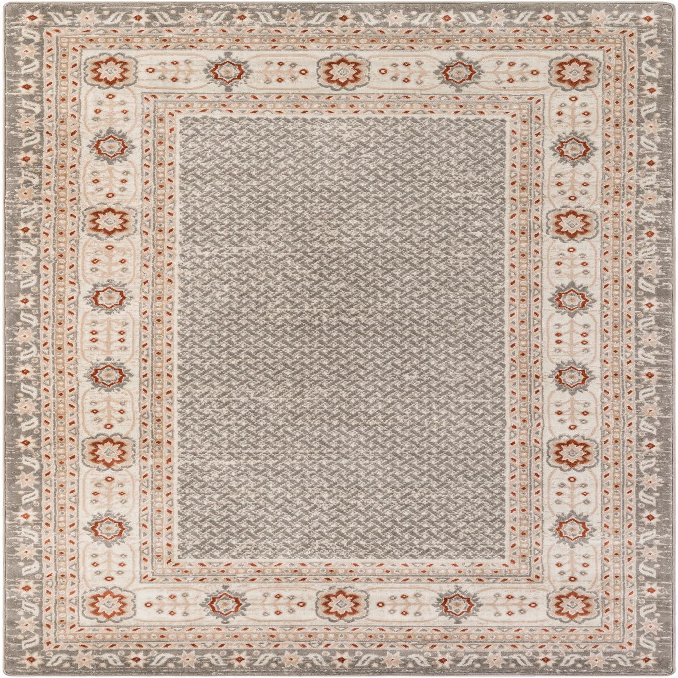 A 6x9 rectangular Charlotte rug in steel gray with a detailed traditional border featuring floral motifs in cream, rust, and beige.
