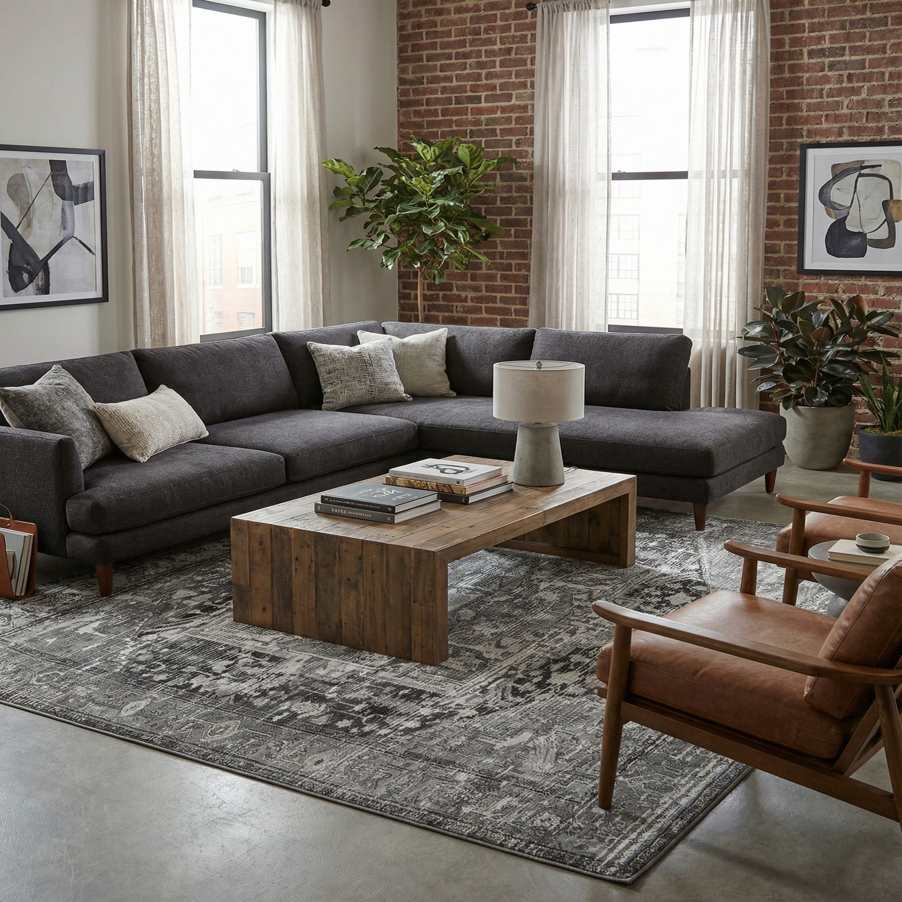 Primary color is Steel Gray. Colors in this rug include: Steel Gray, Black, Ivory.