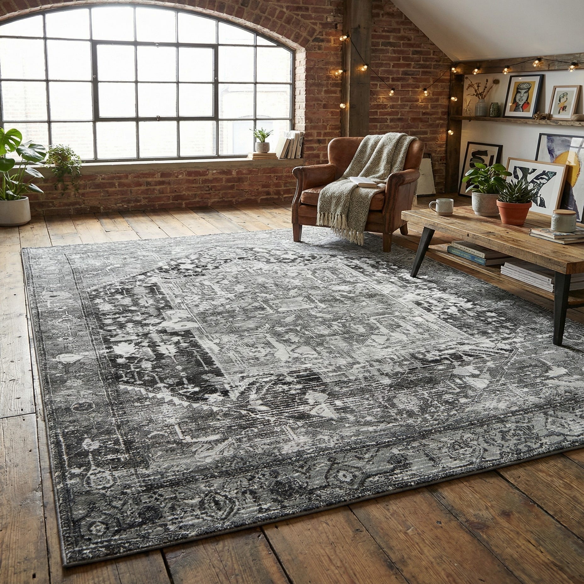 A gently distressed medallion pattern gives this rug a vintage-inspired look with modern clarity. Layered motifs and a worn-border effect create visual depth across a steel gray ground, accented by charcoal and soft ivory highlights that pick out the central medallion and border details. The surface has a low, dense pile with a slightly smooth, satiny hand typical of machine-made polyester—comfortable underfoot while showing the pattern with crisp contrast and a subtle sheen.
