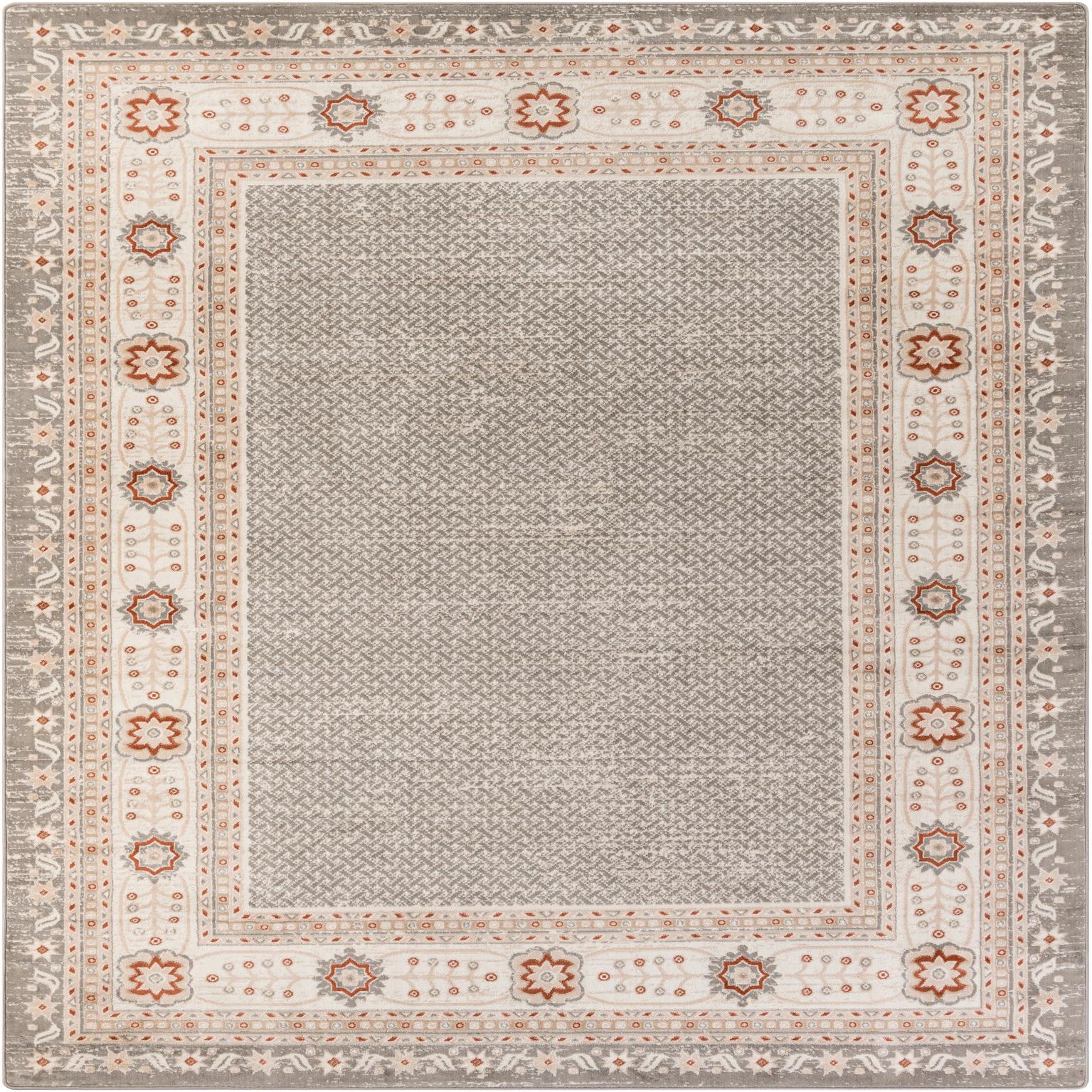 Primary color is Steel gray. Colors in this rug include: Steel gray, Beige, Ivory, Rust Red.