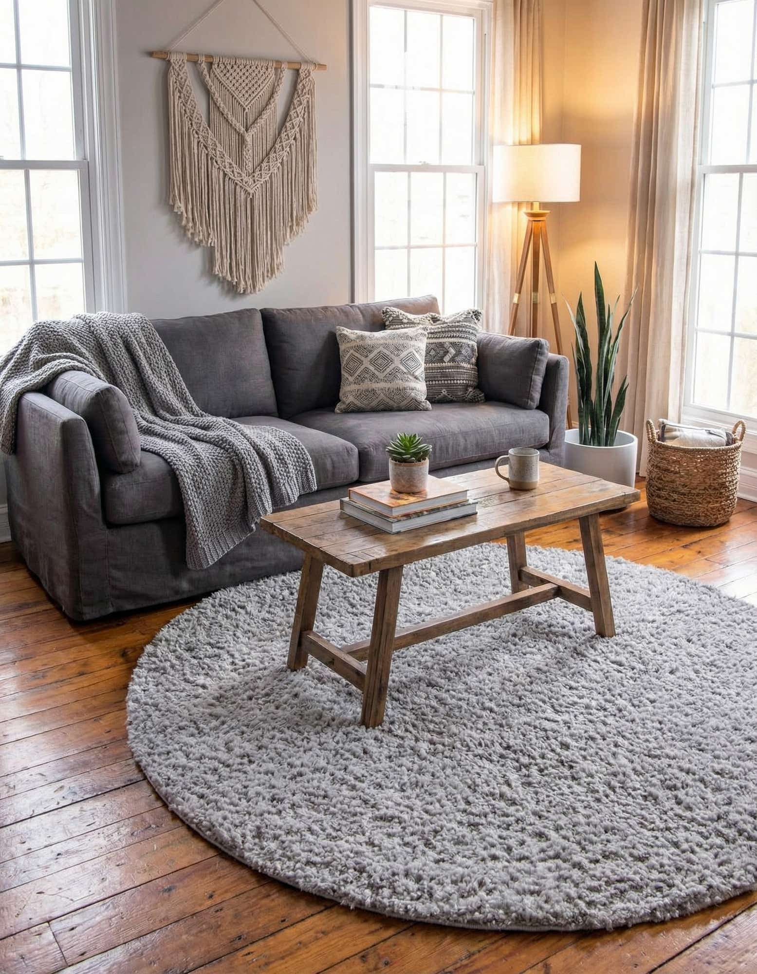 A 6' 0 round gray shag rug with a soft, textured pile, suitable for a living room or bedroom.