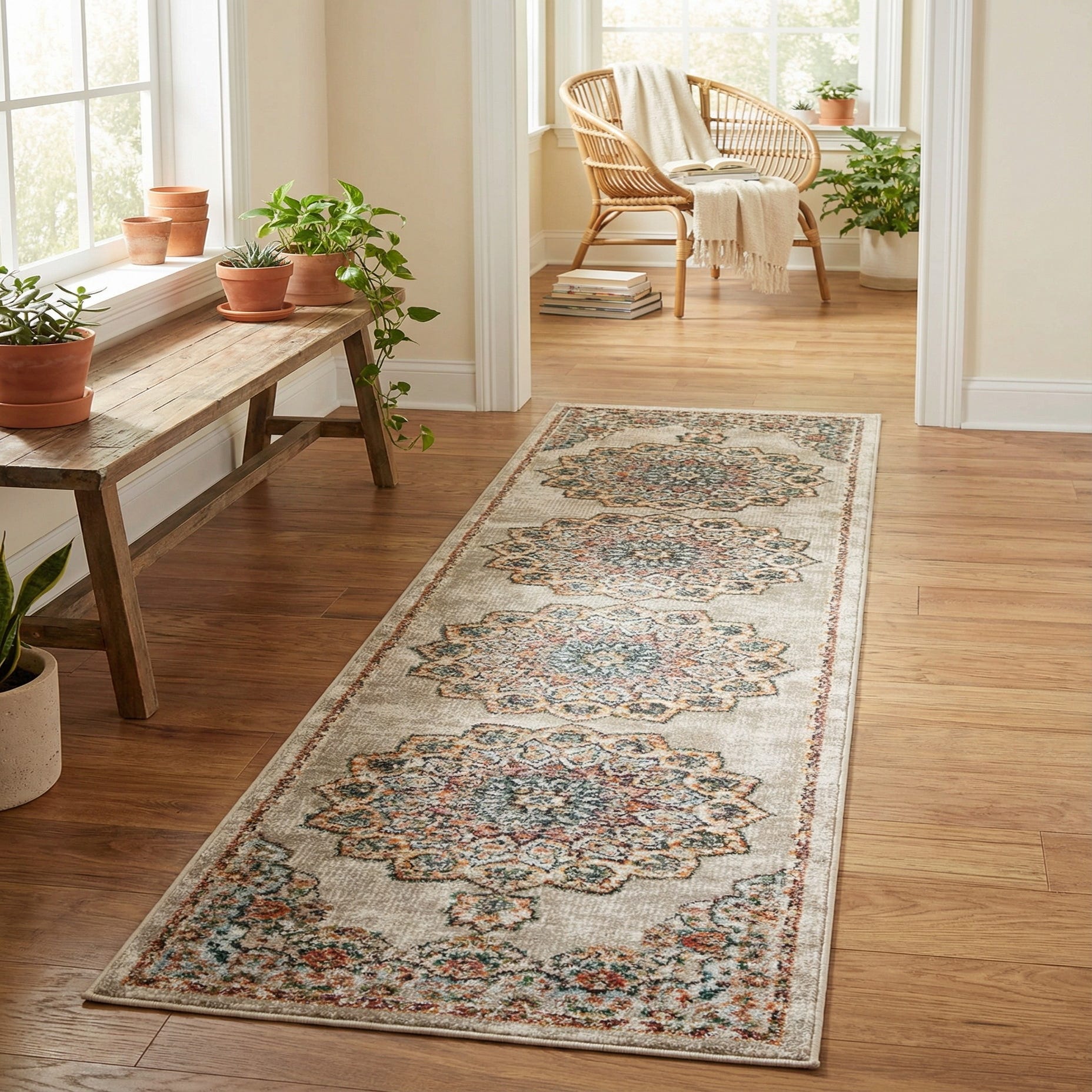 Primary color is Stone Beige. Colors in this rug include: Stone Beige, Beige, Black, Blue, Gray, Green, Ivory, Light Brown, Navy Blue, Red, Rust Red.