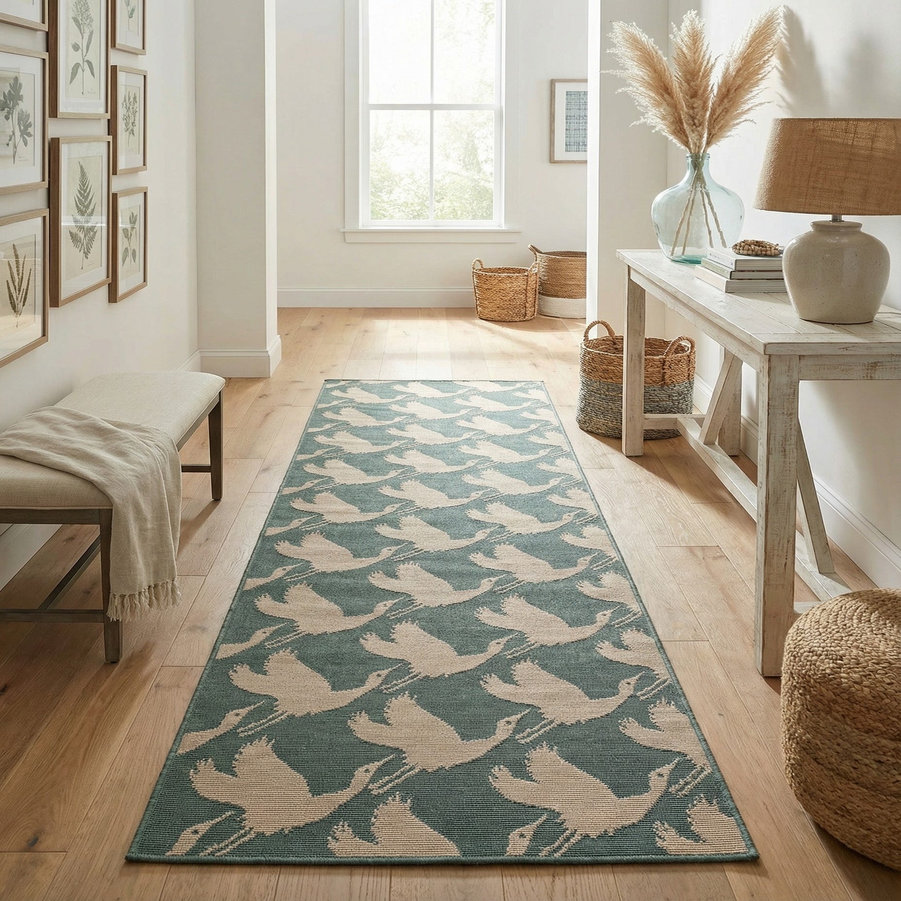 A 10 ft runner rug with a repeating modern pattern of light beige flying geese on a blue-gray background, ideal for a hallway or patio.