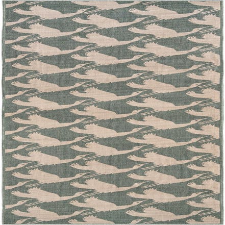 A 12 ft runner rug with a modern blue-green background and an abstract pattern of light beige flying geese, suitable for a hallway or patio.