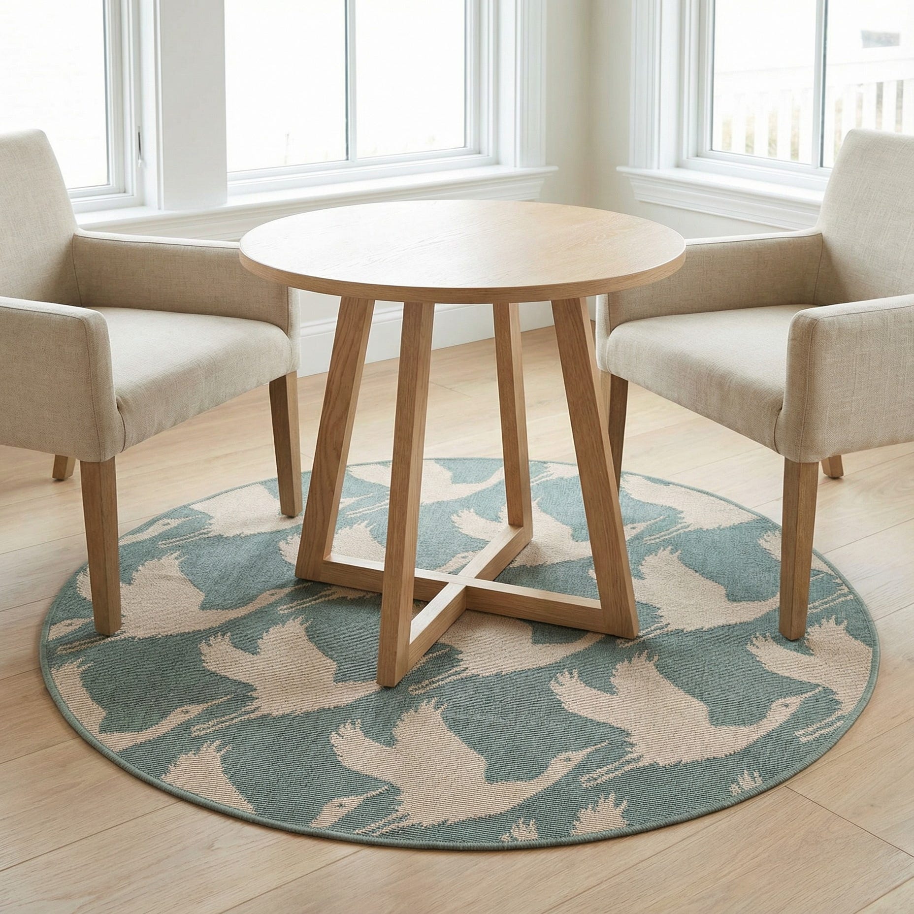 This round piece works well in covered outdoor settings as well as indoor rooms that benefit from a relaxed, coastal look. Place it on a screened porch or sunroom to anchor a conversation area, tuck it under a small bistro table on a balcony, or use it to soften an entryway in a beach house or cottage-style interior. It pairs naturally with light-washed wood, rattan furniture, linen upholstery and brass or matte black accents for a layered, lived-in feel.