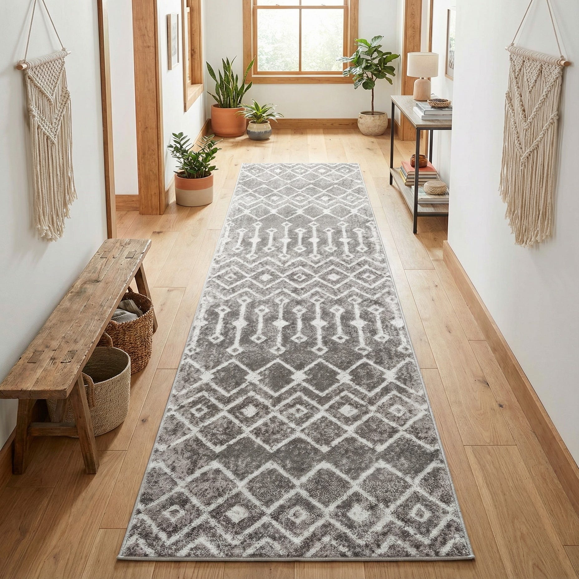 Designed to work as a hallway or entry runner, the neutral stone gray background makes it easy to coordinate with a range of palettes. It suits Scandinavian and modern farmhouse settings when layered over light wood floors, and also complements bohemian or contemporary spaces alongside woven textures, warm metals, and simple upholstery. Use it to add quiet pattern to a narrow kitchen aisle, ground a long foyer, or run alongside a bed for a soft, tonal anchor.