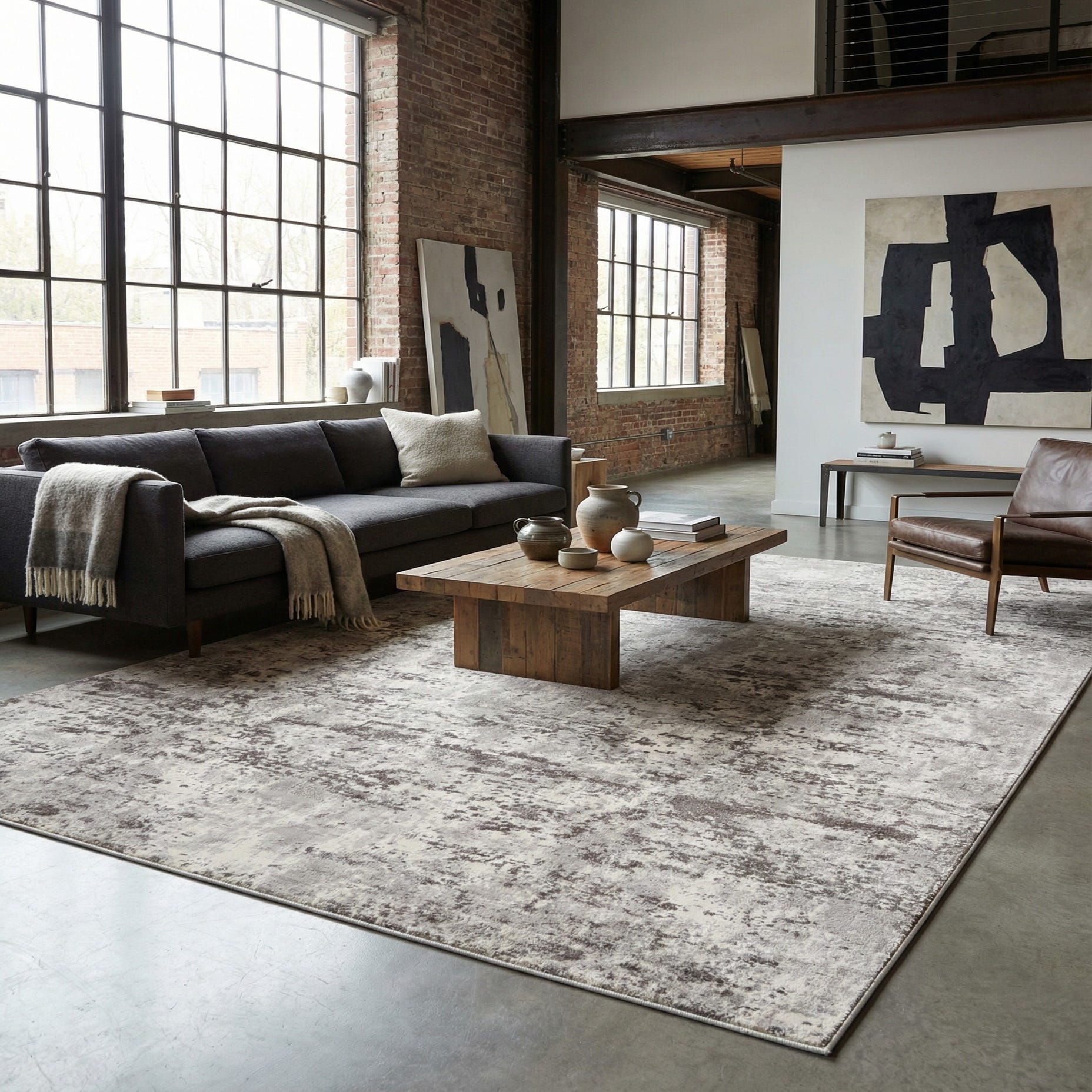 A softly distressed, abstract pattern plays across a stone gray field, layered with washes of ivory and mid-gray that form irregular, painterly striations and speckled accents. The low-profile surface has a smooth, slightly dense hand that feels comfortable underfoot while keeping a sleek, contemporary look. The overall effect is calm and textural—subtle contrast rather than bold ornament—so the rug reads as a neutral anchor with visual interest.