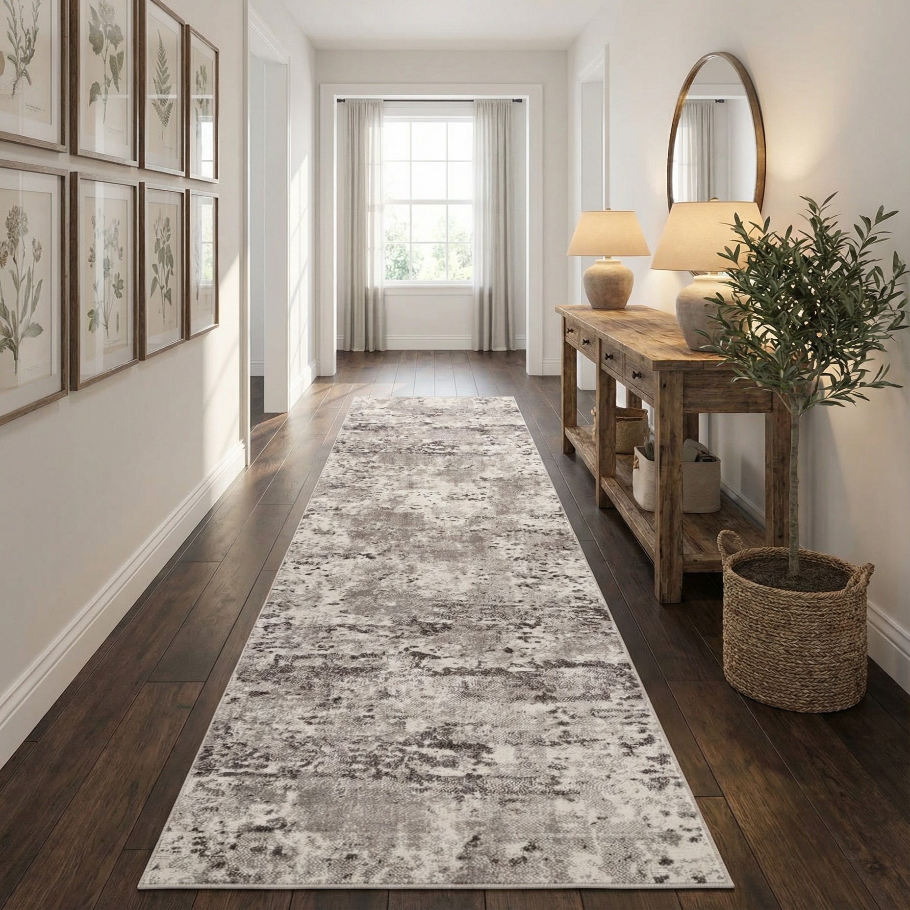 Place this runner in a hallway or entry where its neutral palette will anchor light wood floors, painted millwork, or cool metal accents. It also works well alongside a bed, beneath a slim console, or layered in a contemporary kitchen to add visual interest without competing with bold furnishings. The restrained colorway and abstract pattern make it an easy fit for minimalist, Scandinavian, or modern-traditional interiors.