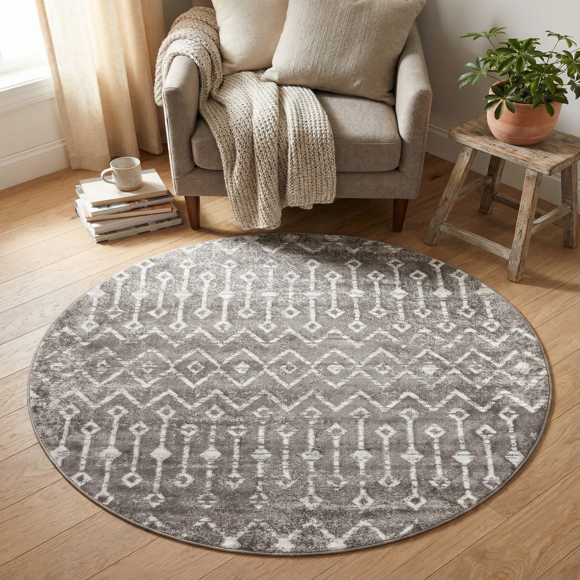 Place it under a small seating group or beneath a round dining or bistro table to define the space. It also works well in an entry, bedroom, or home office and layers nicely over a larger natural-fiber rug. The neutral stone gray and ivory palette pairs smoothly with cool-toned furnishings, light woods, and metal accents, fitting styles from Scandinavian and modern farmhouse to casual bohemian and transitional interiors.