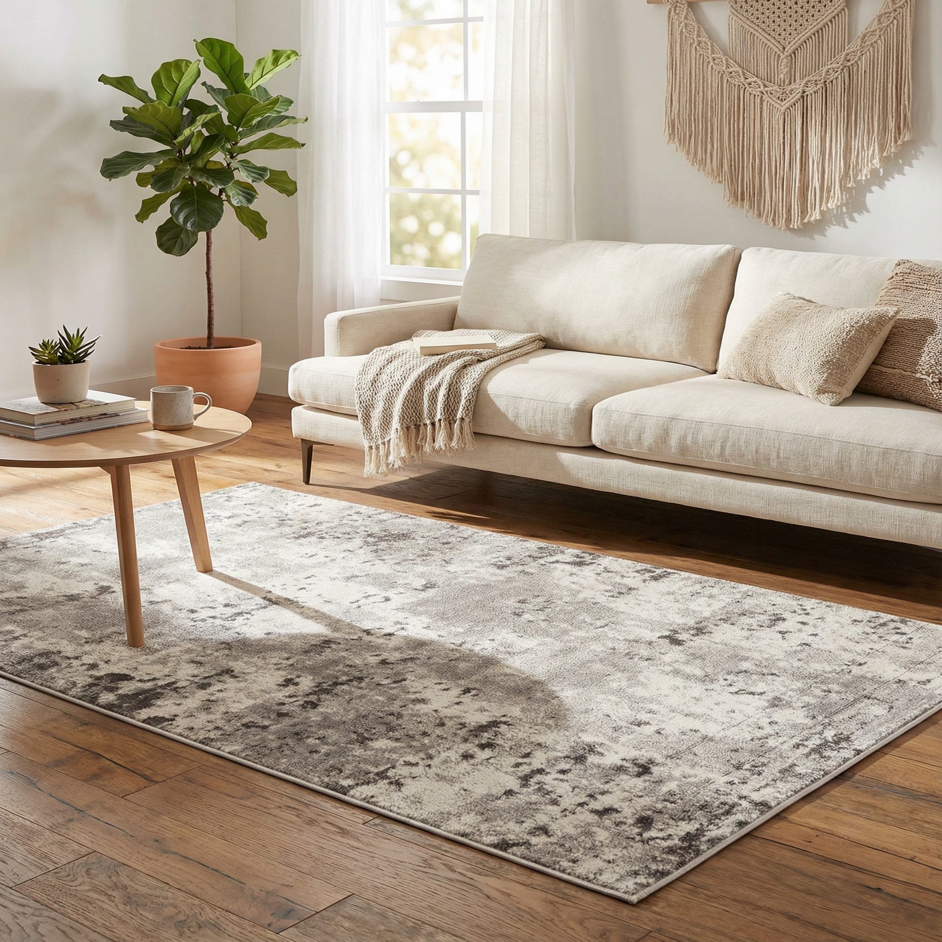 This neutral palette and artful distressing make the rug versatile for a range of interiors: place it in front of a sofa or beneath a small coffee table in a modern living room, layer it at the foot of a bed in a calming bedroom, or anchor a compact seating nook or home office. It pairs well with warm wood tones and cool metal accents, linen upholstery, and leather finishes, fitting into contemporary, transitional, or Scandinavian-inspired schemes.