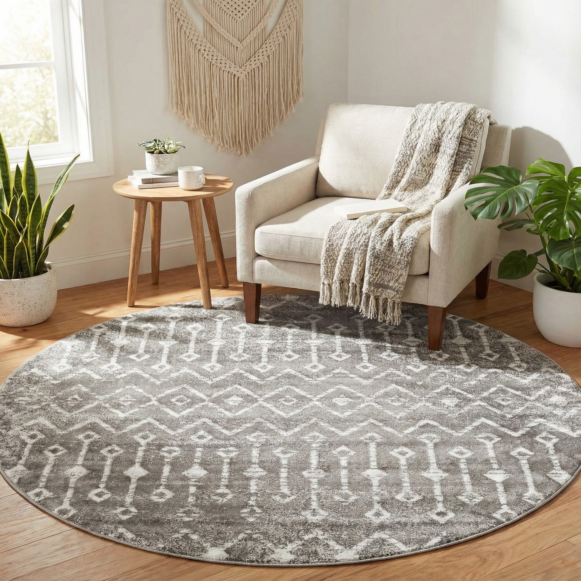 This round style pairs easily with a range of interiors: place it beneath a low-profile coffee table in a modern living room to anchor seating, use it under a small dining table or breakfast nook for a pulled-together casual look, or set it in a bedroom to add pattern and understated contrast beside the bed. It complements neutral, Scandinavian, and bohemian schemes—think light woods, rattan accents, soft ivory upholstery, and mixed-texture throws and pillows.