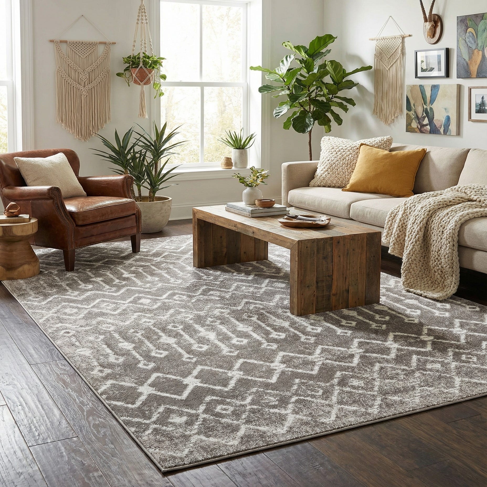 The Bohemian Trellis collection presents a versatile 5x8 rug, machine-woven from 100% polypropylene, ensuring durability and ease of maintenance. The rug displays a modern interpretation of the classic trellis pattern, with interconnected geometric shapes creating a sense of continuity and flow across the surface. The color palette features a stone gray background with ivory accents, providing a neutral base that can effortlessly integrate into a variety of interior settings.