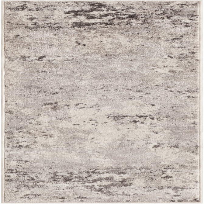 A soft, mineral-inspired pattern unfolds across a stone gray background, punctuated by ivory and gray accents that create a gently variegated surface. The abstract, slightly mottled design avoids harsh lines, offering a calm, contemporary aesthetic that reads as natural texture rather than busy pattern. Machine-made from 100% polypropylene, the construction yields a low, velvety pile with a subtle high-low effect and soft hand underfoot, while the muted palette keeps the overall look versatile and understated.