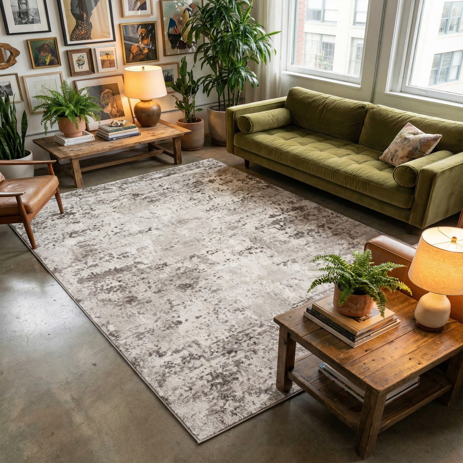 This rug works well as an anchor for contemporary and transitional spaces—place it under a living room seating group to unify tonal sofas and metal or wood accents, slide it beneath a bed to add soft texture to a neutral bedroom, or use it in an entry or home office to introduce layered warmth without overwhelming the room. Its cool, neutral palette pairs nicely with light woods, black or brushed nickel hardware, leather upholstery, and muted textiles for a calm, cohesive look.