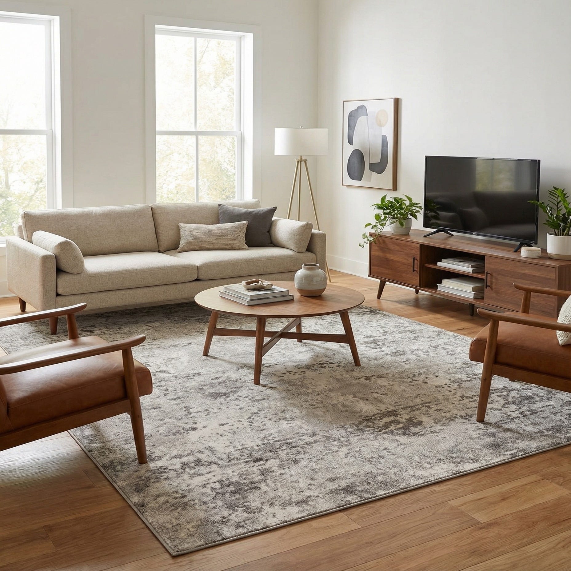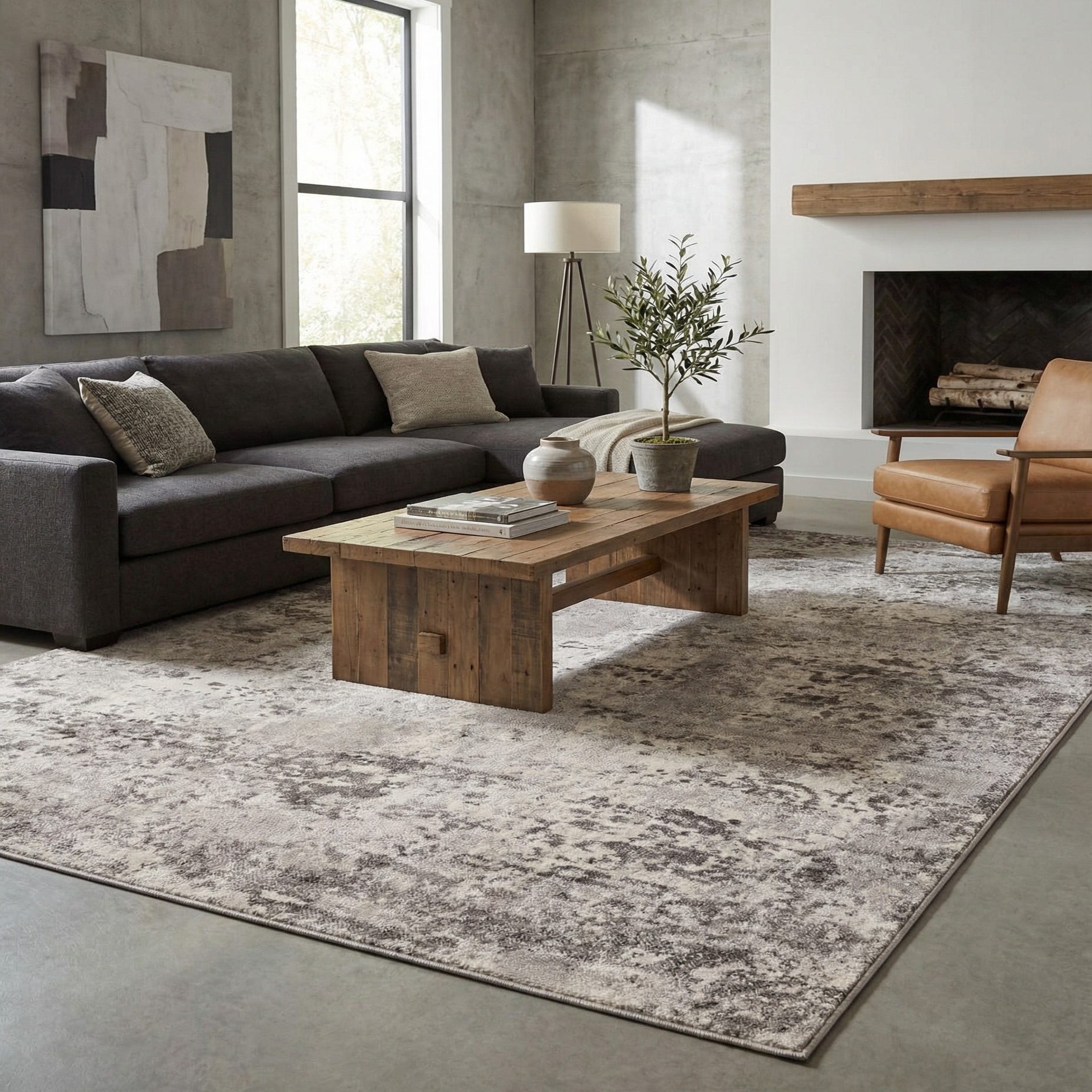 This rug works well as an anchor for contemporary and transitional spaces—place it under a living room seating group to unify tonal sofas and metal or wood accents, slide it beneath a bed to add soft texture to a neutral bedroom, or use it in an entry or home office to introduce layered warmth without overwhelming the room. Its cool, neutral palette pairs nicely with light woods, black or brushed nickel hardware, leather upholstery, and muted textiles for a calm, cohesive look.
