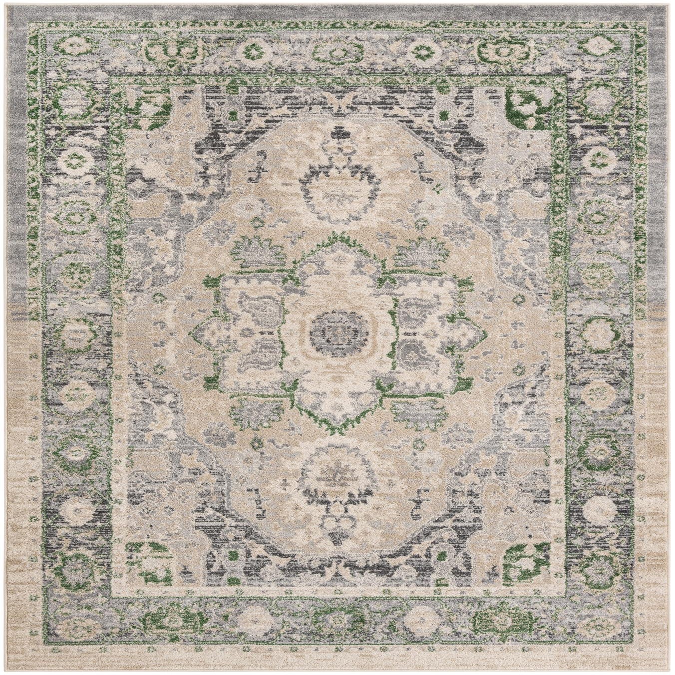 Primary color is Stone Gray. Colors in this rug include: Stone Gray, Ivory, Green.