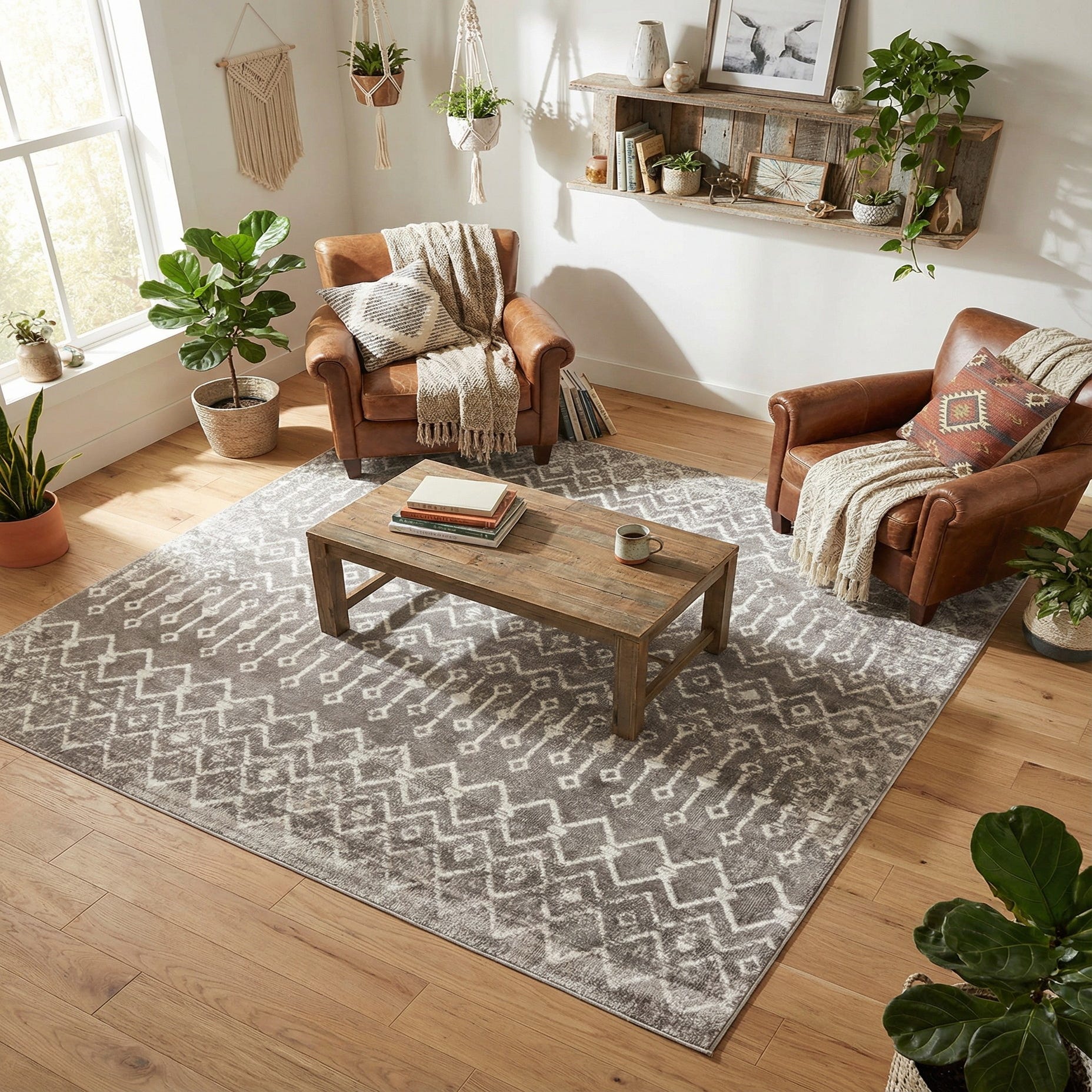 This rug works well anchoring a seating area, adding subtle pattern beneath a bed, or grounding a home office without overwhelming the room. It pairs naturally with warm wood tones and neutral upholstery, and also complements rattan, leather or metal accents for a layered bohemian or transitional aesthetic. For a more casual look, layer it over a natural-fiber rug; for a cleaner modern feel, keep surrounding furnishings simple and let the pattern provide quiet visual interest.
