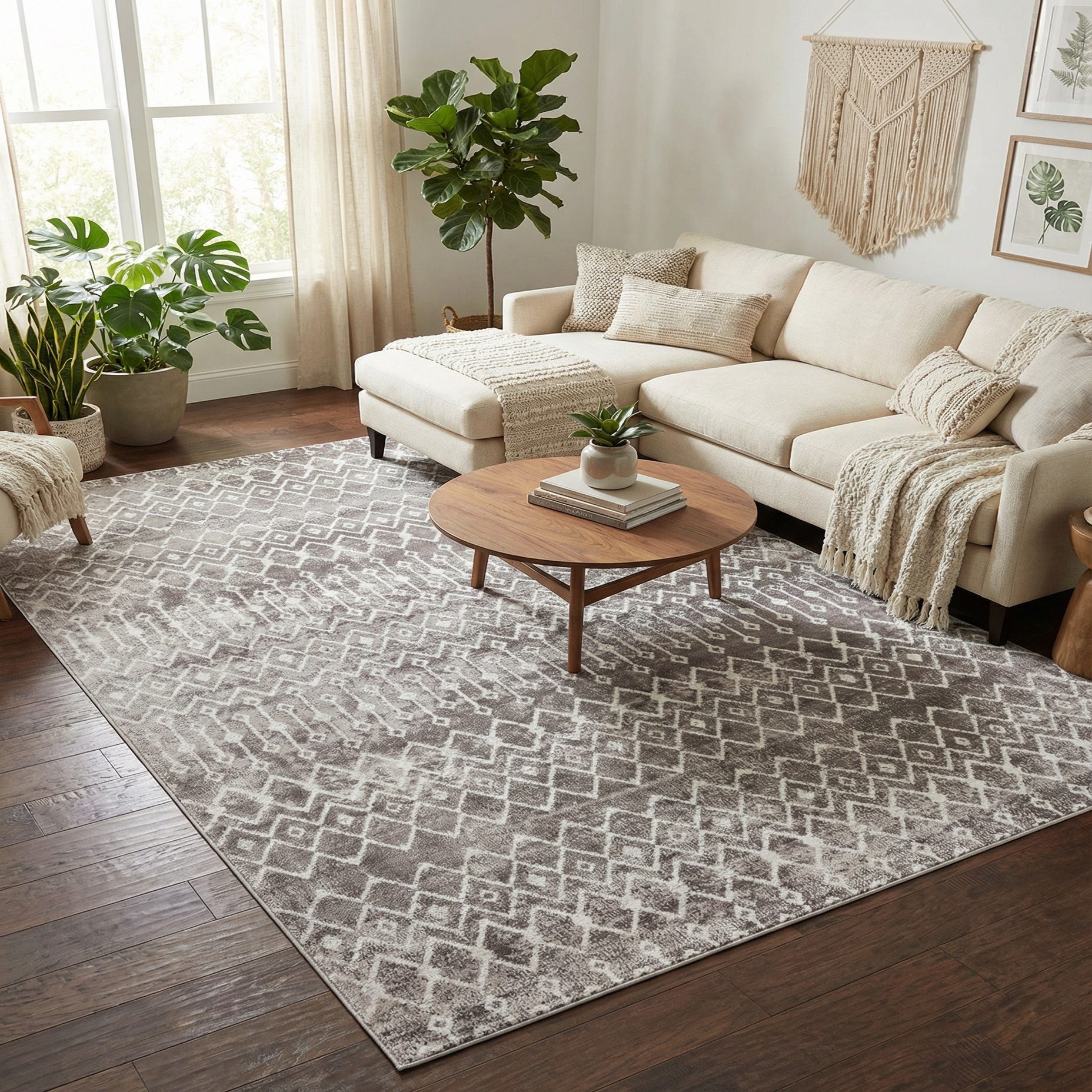 The pile feels smooth underfoot with a subtle sheen from the polypropylene fibers, offering a tactile presence that anchors a room without overwhelming it. Pair this rug with warm wood furniture and woven accents for a modern bohemian living room, use it to define an open-plan dining area beneath a table, or place it in a bedroom to add layered texture and a calming foundation. The stone gray and ivory tones coordinate easily with matte black, brass, or soft pastel accents.
