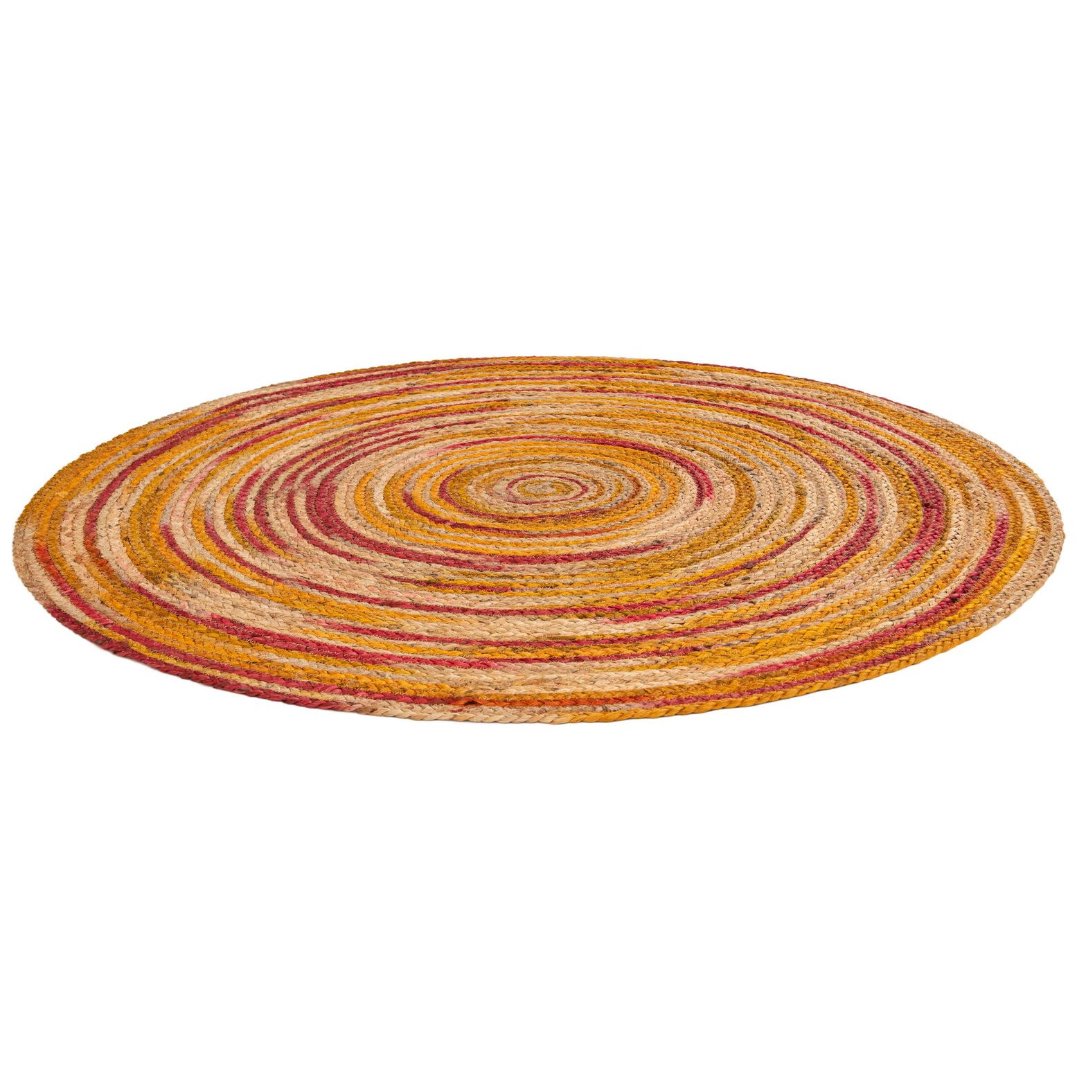 A round, braided jute rug featuring concentric circles of natural tan, orange, and pinkish-red, creating a vibrant, modern look.