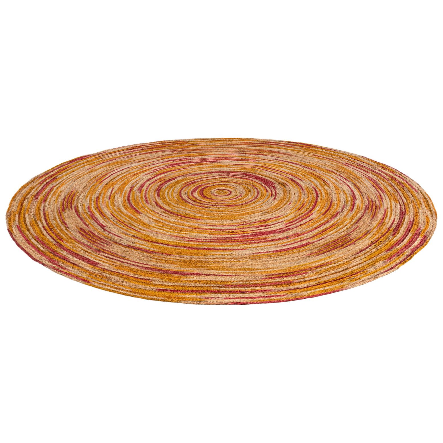 A 7' 10 round jute rug featuring a modern spiral pattern in oranges, pinks, and yellows.
