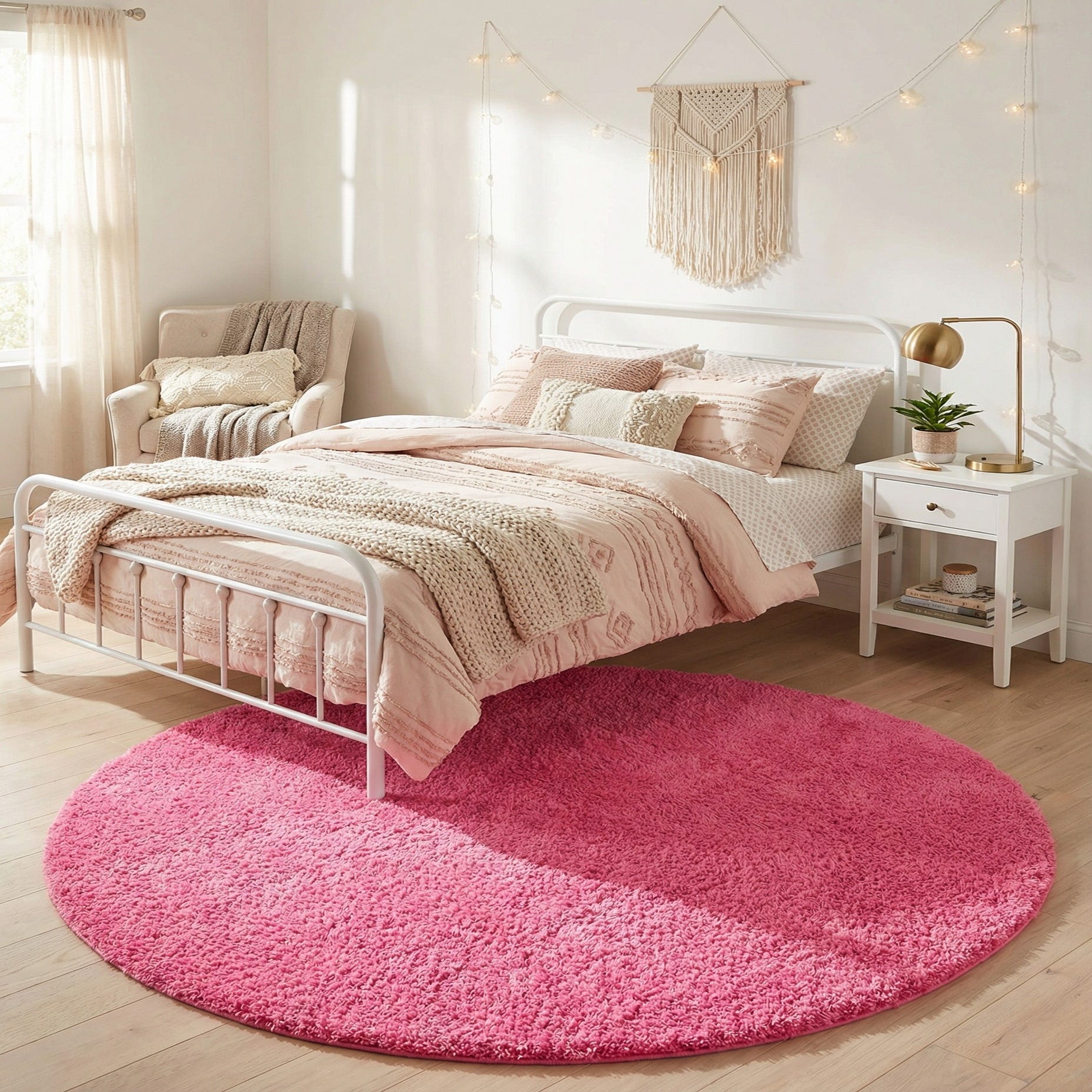 A plush, solid shag in a lively Taffy Pink brings a soft, tactile focal point to any room. The dense, high pile is machine-made from 100% polypropylene, giving the surface a springy, cushiony feel underfoot and a consistent, even finish across the round shape. There’s no printed pattern—just a uniform, velvet-like field of color that creates visual warmth and a gentle sense of depth as the fibers catch the light.