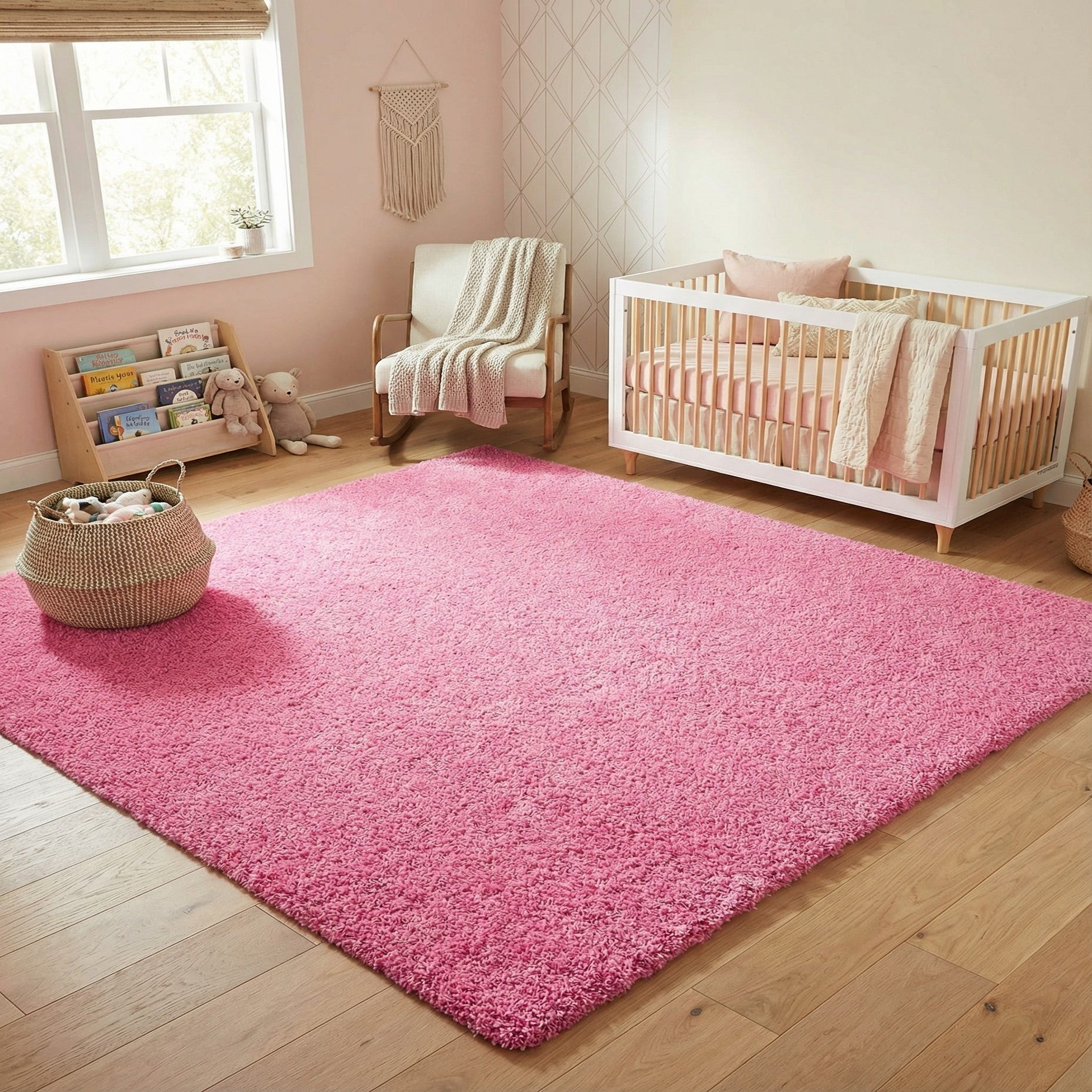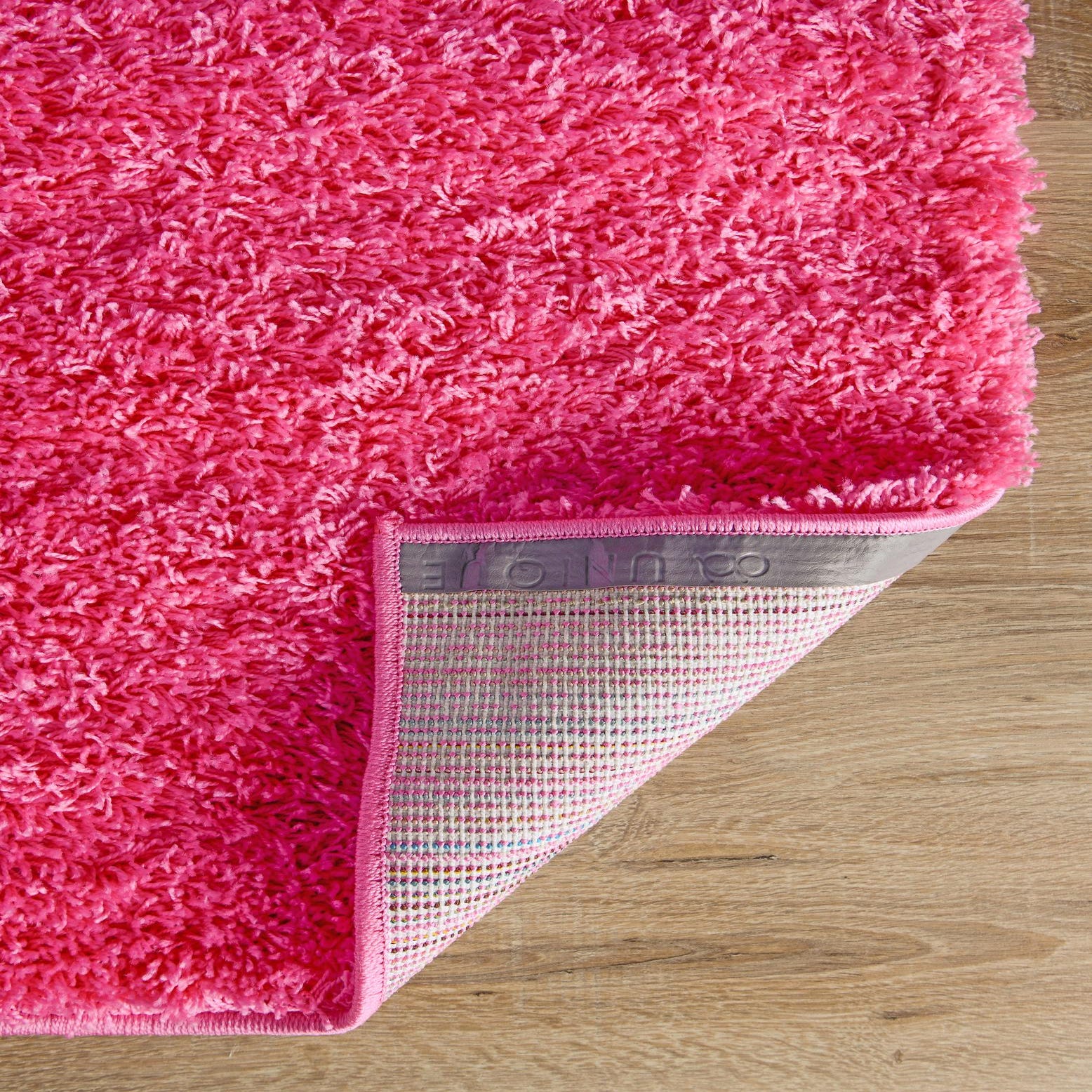 A solid field of Taffy Pink brings a cheerful, modern note to any room. The shag construction — machine made of 100% polypropylene — has a dense, high-cut pile that cushions underfoot; when you run your hand across the surface the long fibers lift and fall with a velvety, tactile quality. The uniform color and lack of pattern provide a clean, contemporary look that layers easily over wood, tile or concrete floors.