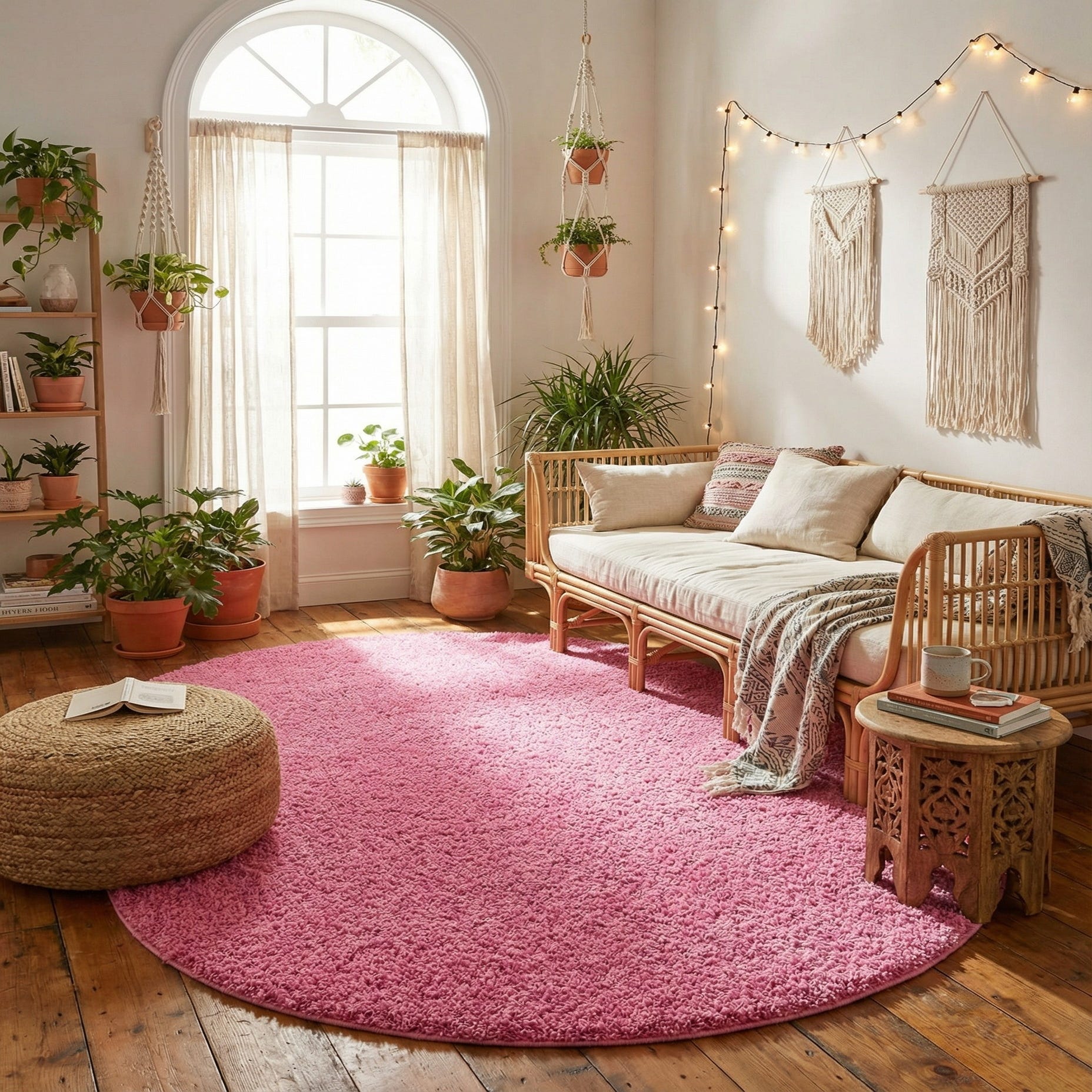 This oval shag rug is a solid field of Taffy Pink, machine made from 100% polypropylene. The pattern is uncomplicated and monochrome, letting the rich pink color take center stage. The shag pile feels plush and cushiony underfoot; the dense, slightly lustrous fibers create a soft, inviting surface that holds its shape while providing a tactile layer to the floor.