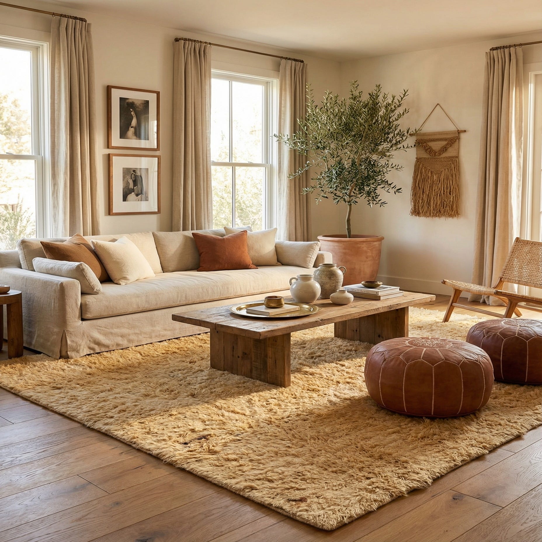 A close-up of a square 9'8" x 10'0" Moroccan shag rug in warm cream and tan wool, showcasing its soft, high pile texture.