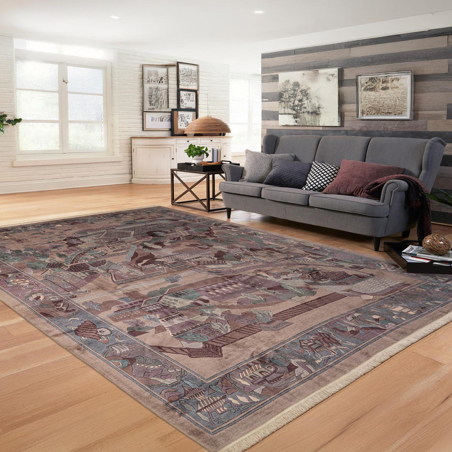 Primary color is Tan. Colors in this rug include: Tan, Purple, Gray, Ivory.