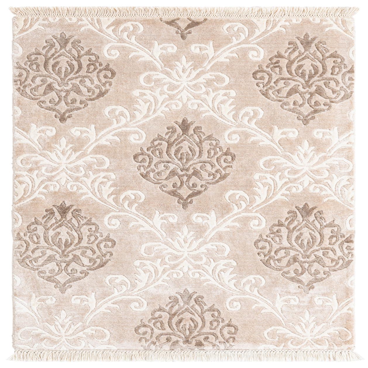 A 3x4 rectangular Darya rug with a modern oriental pattern in brown, tan, and ivory, featuring high pile and fringe.