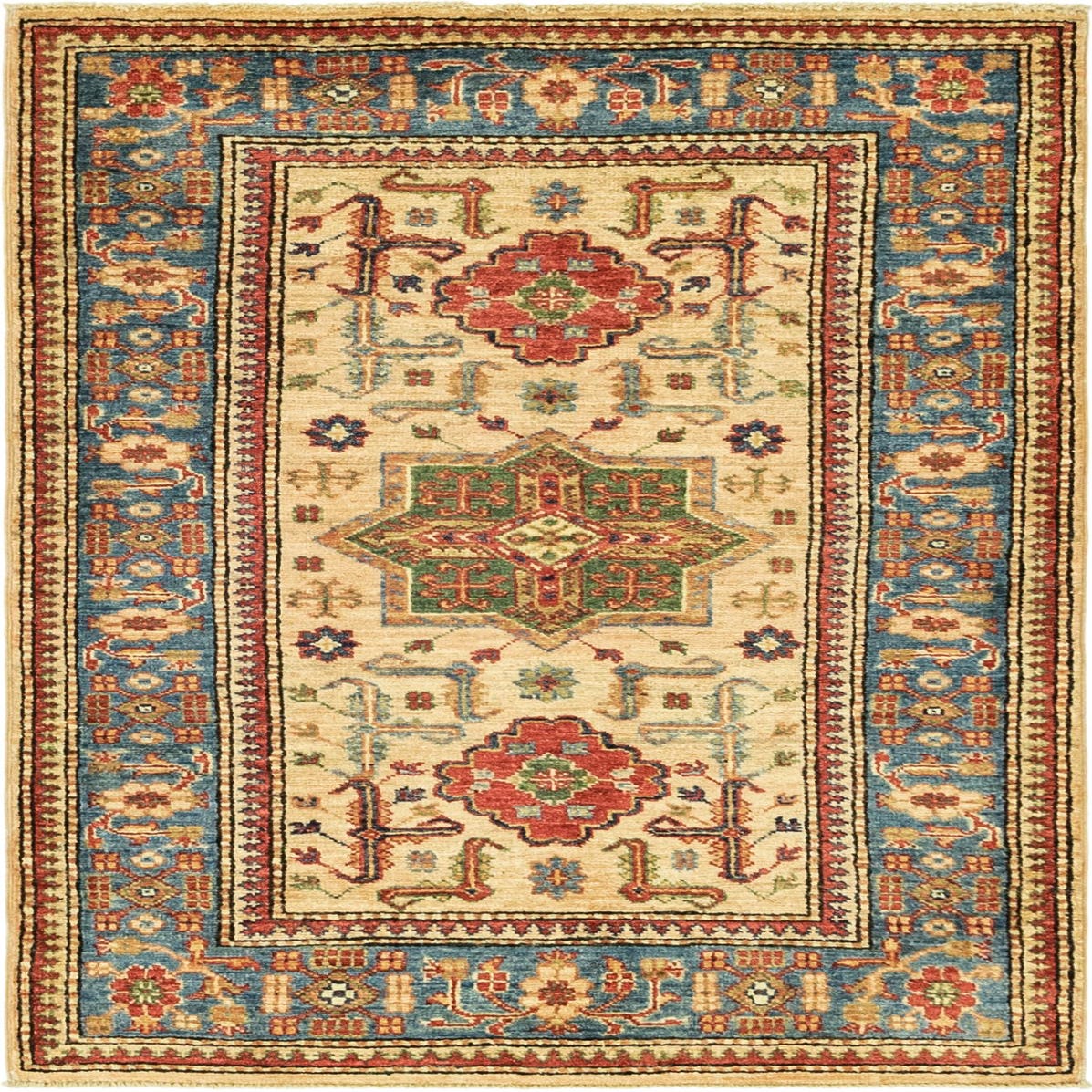 A 3x4 rectangular Kazak rug with a central medallion in green and red on a cream field, bordered by intricate tribal patterns in blue and red.