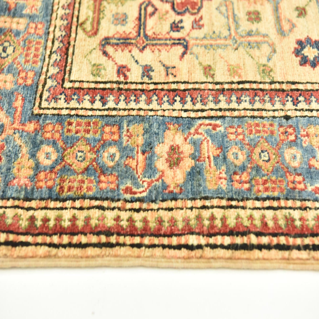 This Kazak collection rug is a hand knotted piece measuring 3 feet by 4 feet, crafted from 100% hand spun wool for enduring quality and a plush, welcoming texture. The rug features a traditionally inspired pattern with well-defined geometric and botanical motifs that give character to its overall design.